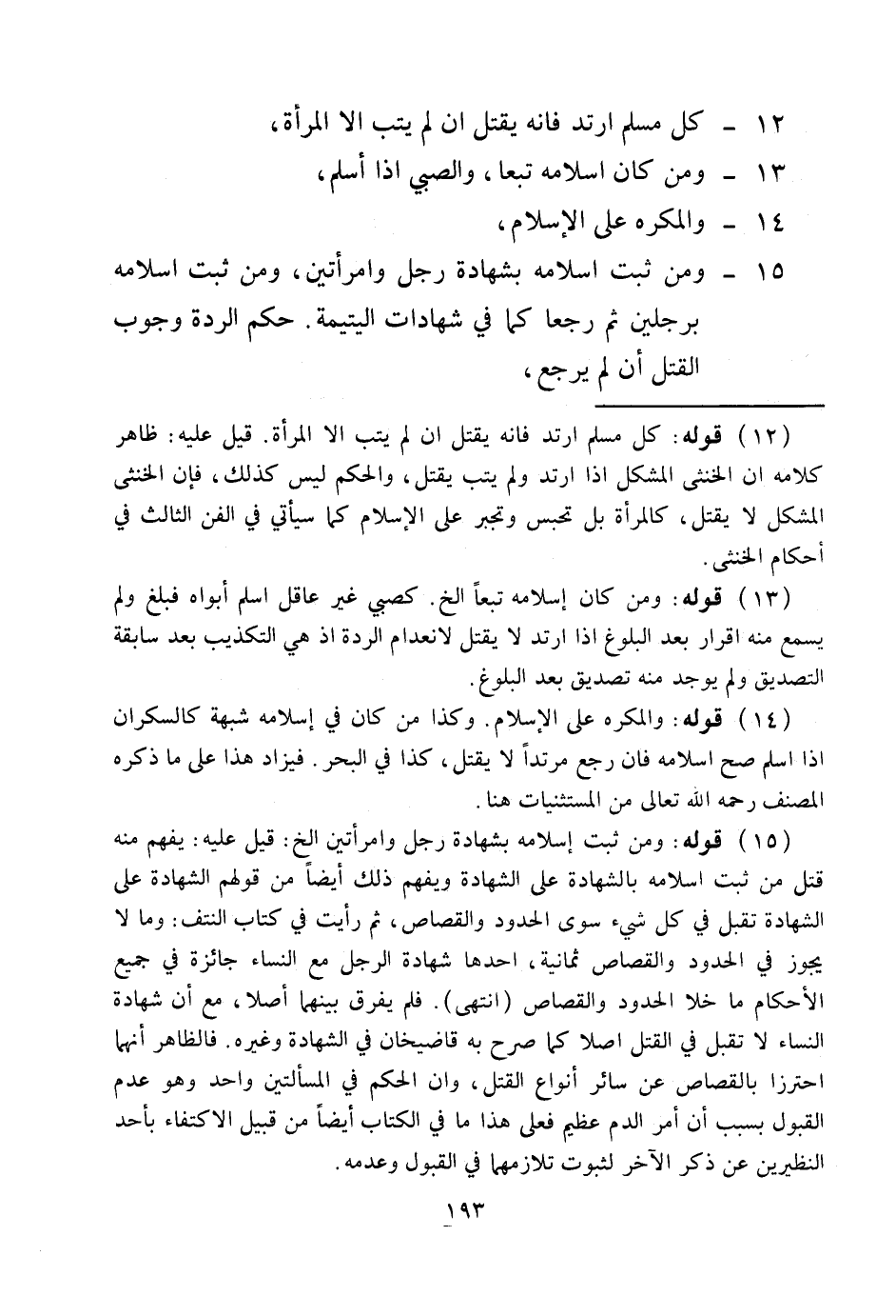 كُلُّ مُسْلِمٍ ارْتَدَّ فَإِنَّهُ يُقْتَلُ إنْ لَمْ يَتُبْ إلَّا الْمَرْأَةَ، 13 - وَمَنْ كَانَ إسْلَامُهُ تَبَعًا، وَالصَّبِيُّ إذَا أَسْلَمَ، 14 - وَالْمُكْرَهُ عَلَى الْإِسْلَامِ، 15 - وَمَنْ ثَبَتَ إسْلَامُهُ بِشَهَادَةِ رَجُلٍ وَامْرَأَتَيْنِ، وَمَنْ ثَبَتَ إسْلَامُهُ بِرَجُلَيْنِ ثُمَّ رَجَعَا كَمَا فِي شَهَادَاتِ الْيَتِيمَةِ.