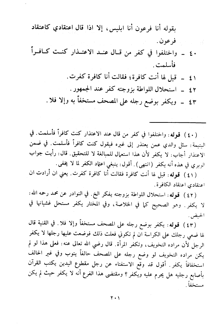 43 - وَيَكْفُرُ بِوَضْعِ رِجْلِهِ عَلَى الْمُصْحَفِ مُسْتَخِفًّا بِهِ وَإِلَّا فَلَا