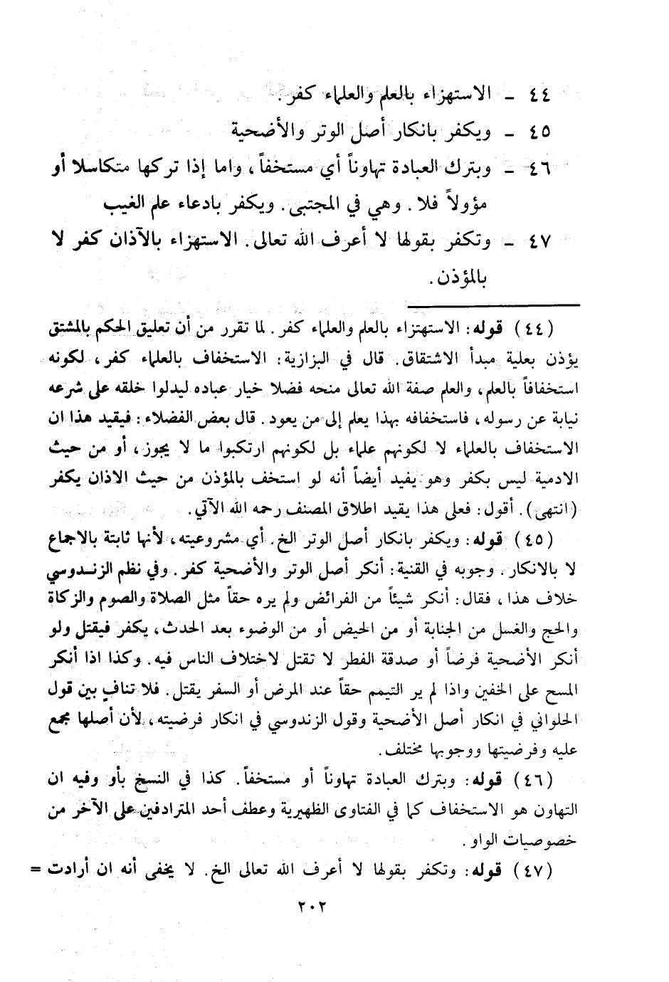 45 - وَيَكْفُرُ بِإِنْكَارِ أَصْلِ الْوِتْرِ وَالْأُضْحِيَّةِ 46 - وَبِتَرْكِ الْعِبَادَةِ تَهَاوُنًا أَيْ مُسْتَخِفًّا، وَأَمَّا إذَا تَرَكَهَا مُتَكَاسِلًا أَوْ مُؤَوِّلًا فَلَا. وَهِيَ فِي الْمُجْتَبَى. وَيَكْفُرُ بِادِّعَاءِ عِلْمِ الْغَيْبِ