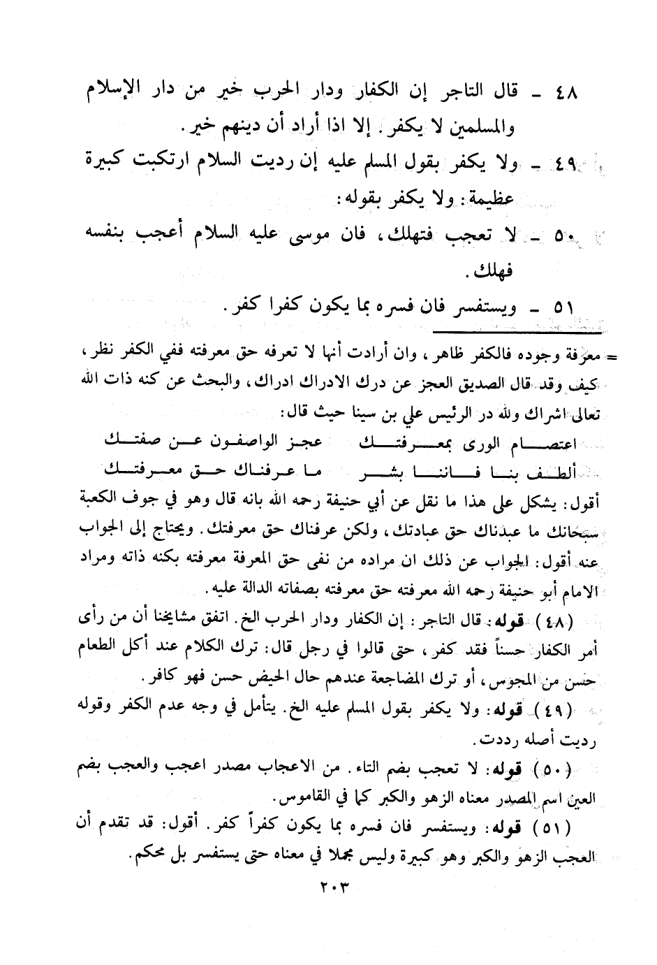 49 - وَلَا يَكْفُرُ بِقَوْلِ الْمُسَلِّمِ عَلَيْهِ إنْ رَدِّيت السَّلَامَ ارْتَكَبْت كَبِيرَةً عَظِيمَةً وَلَا يَكْفُرُ بِقَوْلِهِ: 50 - لَا تُعْجَبْ فَتَهْلَكْ، فَإِنَّ مُوسَى - عَلَيْهِ السَّلَامُ - أُعْجِبَ بِنَفْسِهِ فَهَلَكَ. 51 - وَيَسْتَفْسِرُ فَإِنْ فَسَّرَهُ بِمَا يَكُونُ كُفْرًا كَفَرَ