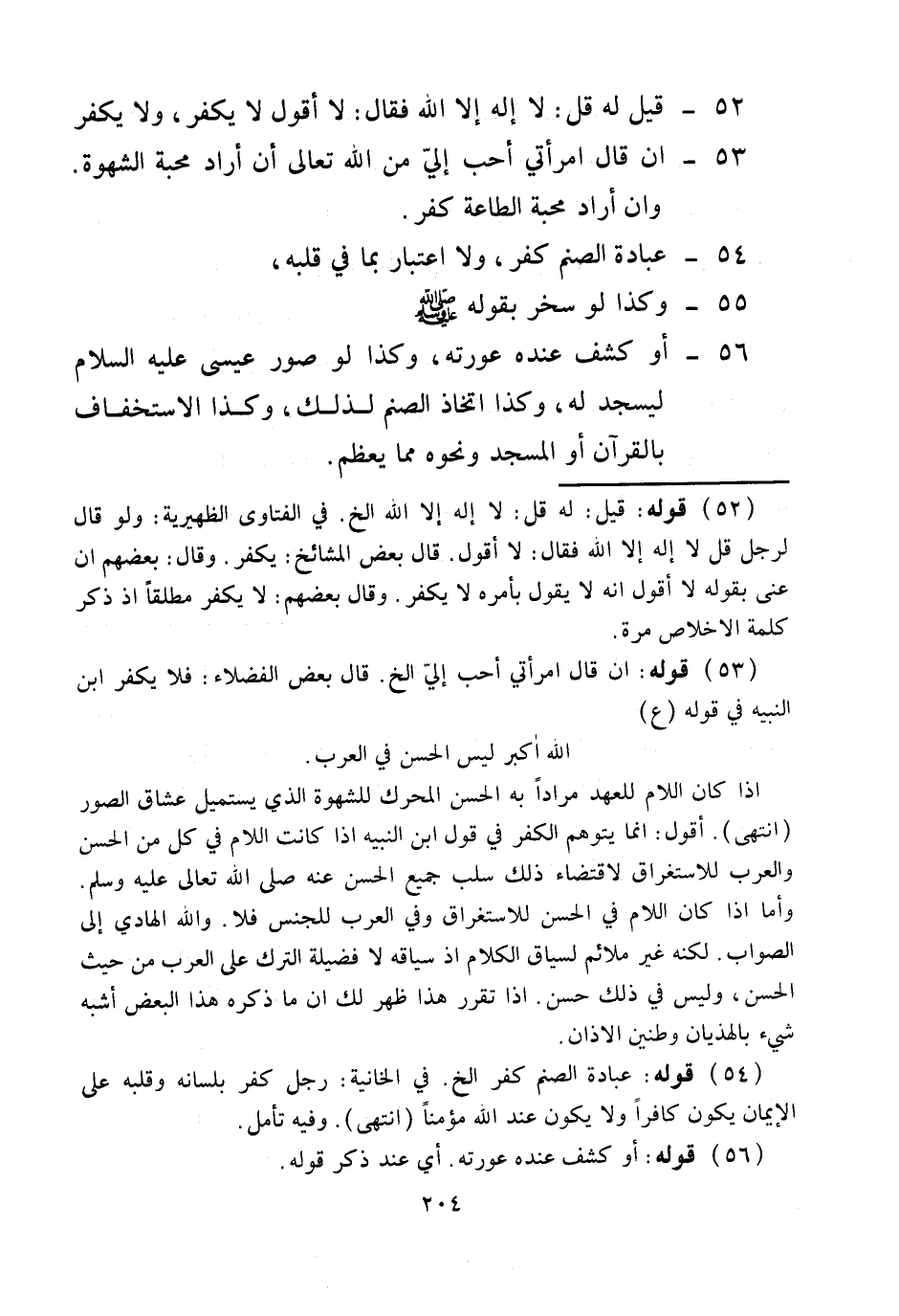 54 - عِبَادَةُ الصَّنَمِ كُفْرٌ، وَلَا اعْتِبَارَ بِمَا فِي قَلْبِهِ، 55 - وَكَذَا لَوْ سَخِرَ بِقَوْلِهِ - صَلَّى اللَّهُ عَلَيْهِ وَسَلَّمَ - 56 - أَوْ كَشَفَ عِنْدَهُ عَوْرَتَهُ، وَكَذَا لَوْ صَوَّرَ عِيسَى - عَلَيْهِ السَّلَامُ - لِيَسْجُدَ لَهُ، وَكَذَا اتِّخَاذُ الصَّنَمِ لِذَلِكَ، وَكَذَا الِاسْتِخْفَافُ بِالْقُرْآنِ أَوْ الْمَسْجِدِ وَنَحْوِهِ مِمَّا يُعَظَّمُ