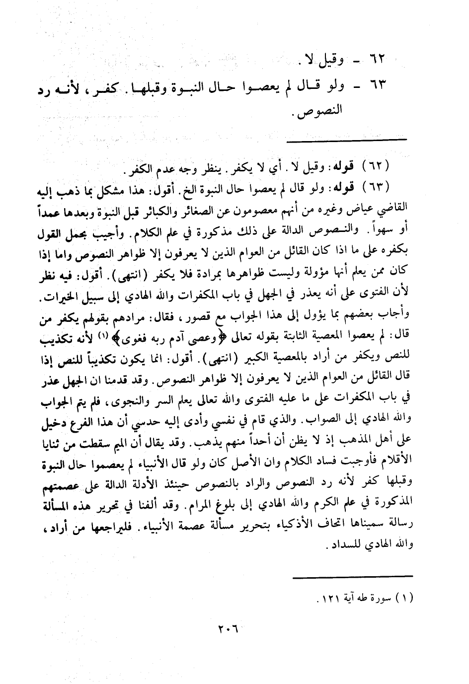 (63) قَوْلُهُ: وَلَوْ قَالَ لَمْ يَعْصُوا حَالَ النُّبُوَّةِ إلَخْ أَقُولُ: هَذَا مُشْكِلٌ بِمَا ذَهَبَ إلَيْهِ الْقَاضِي عِيَاضٌ وَغَيْرُهُ مِنْ أَنَّهُمْ مَعْصُومُونَ عَنْ الصَّغَائِرِ وَالْكَبَائِرِ قَبْلَ النُّبُوَّةِ وَبَعْدَهَا عَمْدًا أَوْ سَهْوًا وَالنُّصُوصُ الدَّالَّةُ عَلَى ذَلِكَ مَذْكُورَةٌ فِي عِلْمِ الْكَلَامِ وَأُجِيبَ بِحَمْلِ الْقَوْلِ بِكُفْرِهِ عَلَى مَا إذَا كَانَ الْقَائِلُ مِنْ الْعَوَامّ الَّذِينَ لَا يَعْرِفُونَ إلَّا ظَوَاهِرَ النُّصُوصِ وَأَمَّا إذَا كَانَ مِمَّنْ يَعْلَمُ أَنَّهَا مُؤَوَّلَةٌ وَلَيْسَتْ ظَوَاهِرُهَا بِمُرَادَةٍ فَلَا يَكْفُرُ (انْتَهَى) .
