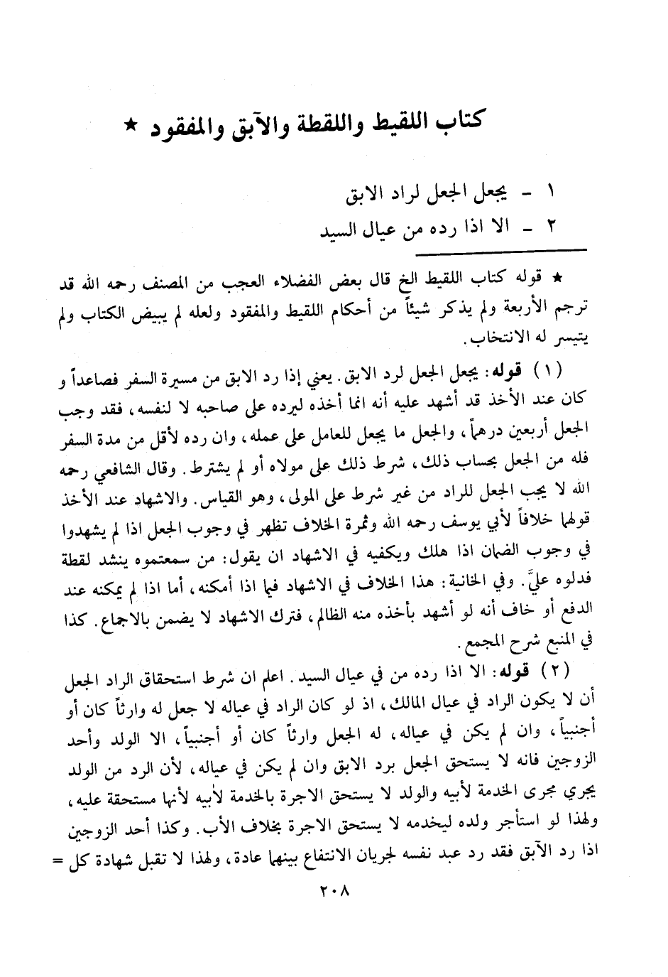1 - يُجْعَلُ الْجُعْلُ لِرَادِّ الْآبِقِ 2 - إلَّا إذَا رَدَّهُ مِنْ عِيَالِ السَّيِّدِ