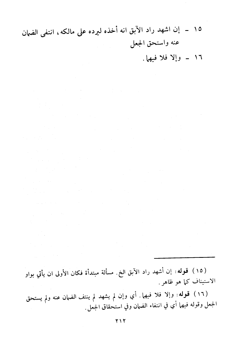 ـــــــــــــــــــــــــــــQ (15) قَوْلُهُ: إنْ أَشْهَدَ رَادُّ الْآبِقِ إلَخْ مَسْأَلَةٌ مُبْتَدَأَةٌ فَكَانَ الْأَوْلَى إنْ يَأْتِيَ بِوَاوِ الِاسْتِئْنَافِ كَمَا هُوَ ظَاهِرٌ (16) قَوْلُهُ: وَإِلَّا فَلَا فِيهِمَا أَيْ وَإِنْ لَمْ يُشْهِدْ لَمْ يَنْتَفِ الضَّمَانُ عَنْهُ وَلَمْ يَسْتَحِقَّ الْجُعْلَ وَقَوْلُهُ فِيهِمَا أَيْ فِي انْتِفَاءِ الضَّمَانِ وَفِي اسْتِحْقَاقِ الْجُعْلِ