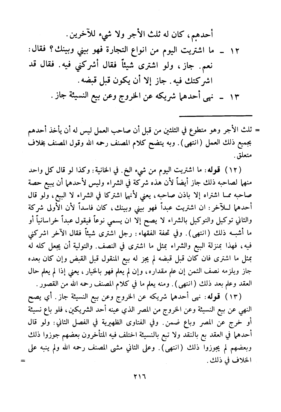 (13) قَوْلُهُ: نَهَى أَحَدُهُمَا شَرِيكَهُ عَنْ الْخُرُوجِ وَعَنْ بَيْعِ النَّسِيئَةِ جَازَ أَيْ يَصِحُّ النَّهْيُ عَنْ بَيْعِ النَّسِيئَةِ وَعَنْ الْخُرُوجِ مِنْ الْمِصْرِ الَّذِي عَيَّنَهُ أَحَدُ الشَّرِيكَيْنِ، فَلَوْ بَاعَ نَسِيئَةً أَوْ خَرَجَ عَنْ الْمِصْرِ وَبَاعَ ضَمِنَ.