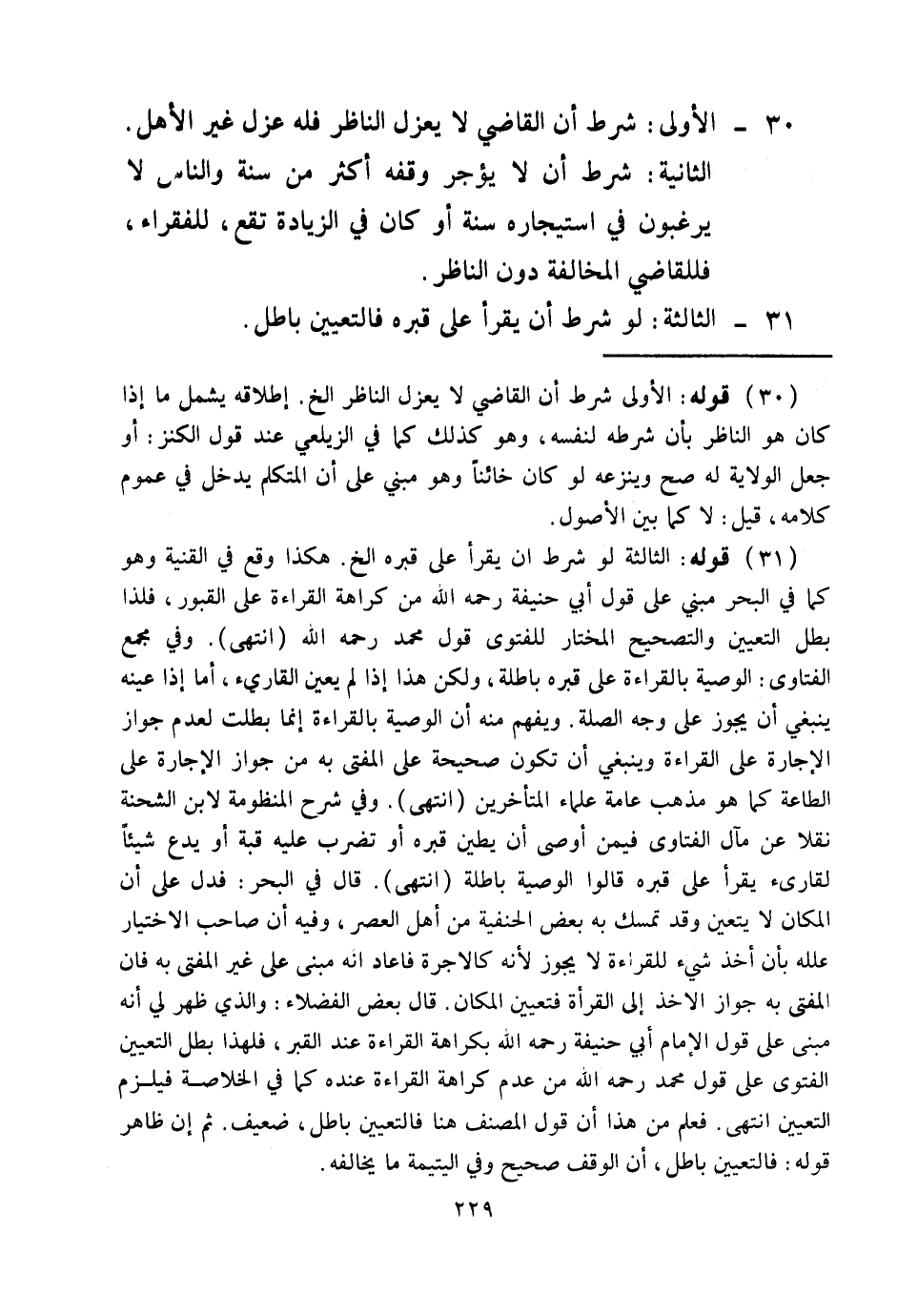 (31) قَوْلُهُ: الثَّالِثَةُ لَوْ شَرَطَ أَنْ يُقْرَأَ عَلَى قَبْرِهِ إلَخْ هَكَذَا وَقَعَ فِي الْقُنْيَةِ وَهُوَ كَمَا فِي الْبَحْرِ مَبْنِيٌّ عَلَى قَوْلِ أَبِي حَنِيفَةَ - رَحِمَهُ اللَّهُ - مِنْ كَرَاهَةِ الْقِرَاءَةِ عَلَى الْقُبُورِ، فَلِذَا بَطَلَ التَّعْيِينُ وَالتَّصْحِيحُ الْمُخْتَارُ لِلْفَتْوَى قَوْلُ مُحَمَّدٍ - رَحِمَهُ اللَّهُ - (انْتَهَى) .