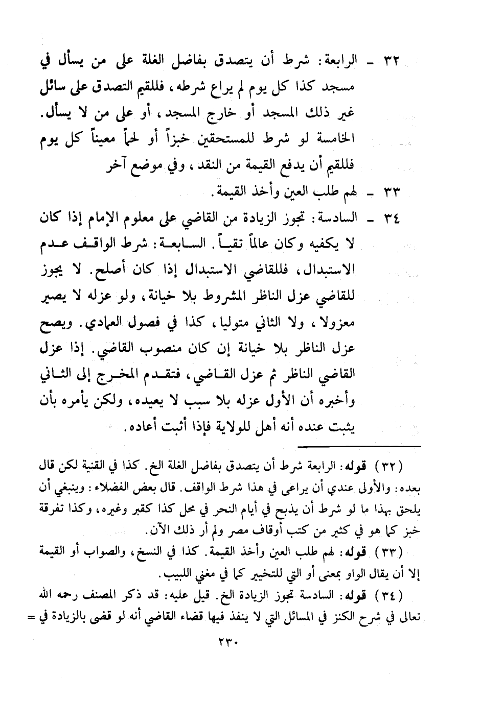 الرَّابِعَةُ: شَرَطَ أَنْ يُتَصَدَّقَ بِفَاضِلِ الْغَلَّةِ عَلَى مَنْ يَسْأَلُ فِي مَسْجِدِ كَذَا كُلَّ يَوْمٍ لَمْ يُرَاعَ شَرْطُهُ، فَلِلْقَيِّمِ التَّصَدُّقُ عَلَى سَائِلِ غَيْرِ ذَلِكَ الْمَسْجِدِ أَوْ خَارِجَ الْمَسْجِدِ، أَوْ عَلَى مَنْ لَا يَسْأَلُ. الْخَامِسَةُ لَوْ شَرَطَ لِلْمُسْتَحِقِّينَ خُبْزًا أَوْ لَحْمًا مُعَيَّنًا كُلَّ يَوْمٍ فَلِلْقَيِّمِ أَنْ يَدْفَعَ الْقِيمَةَ مِنْ النَّقْدِ، وَفِي مَوْضِعٍ آخَرَ 33 - لَهُمْ طَلَبُ الْعَيْنِ وَأَخْذُ الْقِيمَةِ. 34 - السَّادِسَةُ: تَجُوزُ الزِّيَادَةُ مِنْ الْقَاضِي عَلَى مَعْلُومِ الْإِمَامِ إذَا كَانَ لَا يَكْفِيه وَكَانَ عَالِمًا تَقِيًّا السَّابِعَةُ: شَرَطَ الْوَاقِفُ عَدَمَ الِاسْتِبْدَالِ، فَلِلْقَاضِي الِاسْتِبْدَالُ إذَا كَانَ أَصْلَحَ