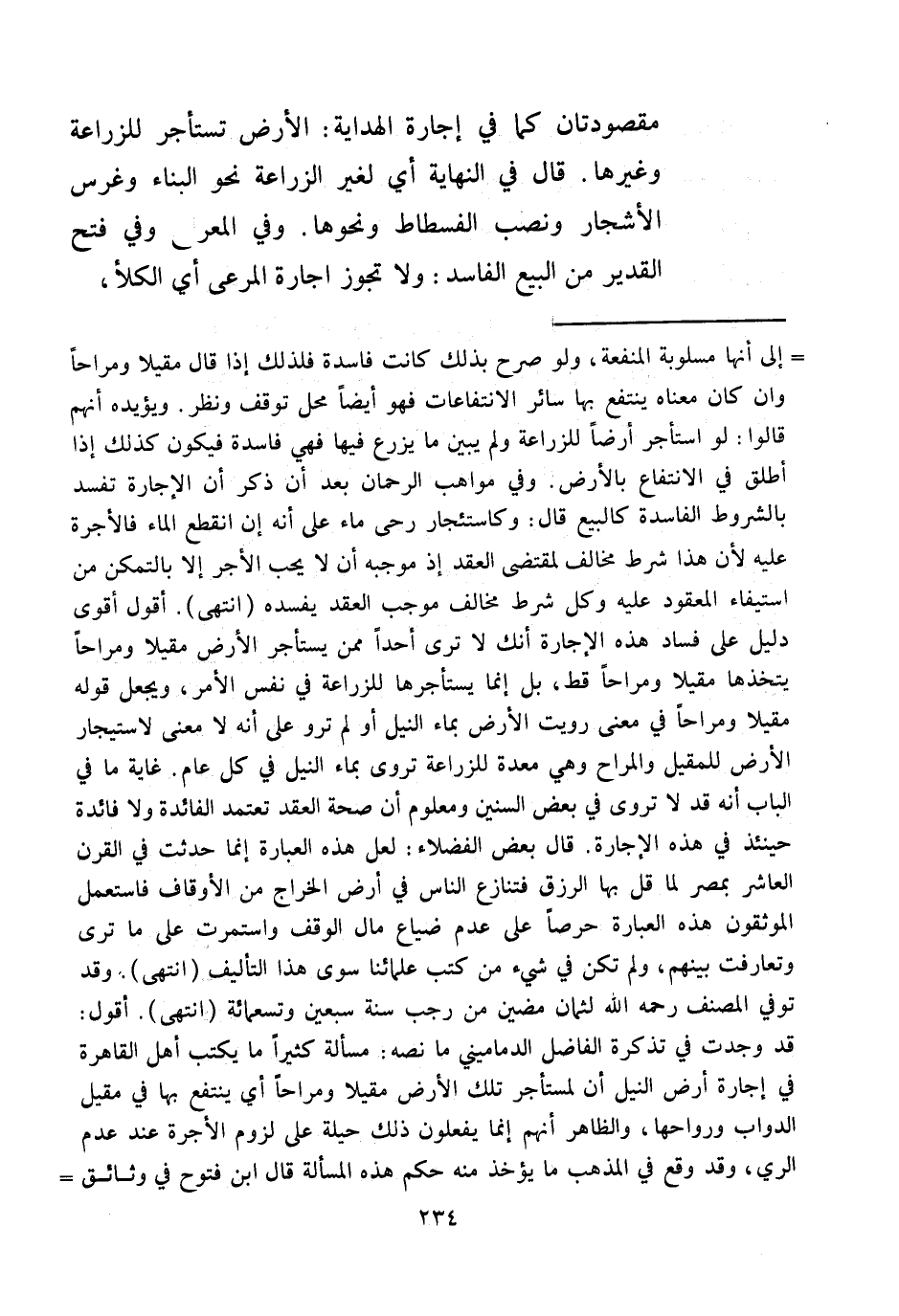 أَقُولُ أَقْوَى دَلِيلٍ عَلَى فَسَادِ هَذِهِ الْإِجَارَةِ أَنَّك لَا تَرَى أَحَدًا مِمَّنْ يَسْتَأْجِرُ الْأَرْضَ مَقِيلًا وَمَرَاحًا يَتَّخِذُهَا مَقِيلًا وَمَرَاحًا قَطُّ، بَلْ إنَّمَا يَسْتَأْجِرُهَا لِلزِّرَاعَةِ فِي نَفْسِ الْأَمْرِ، وَيُجْعَلُ قَوْلُهُ مَقِيلًا وَمَرَاحًا فِي مَعْنَى رُوِيَتْ الْأَرْضُ بِمَاءِ النِّيلِ أَوْ لَمْ تُرْوَ عَلَى أَنَّهُ لَا مَعْنَى لِاسْتِئْجَارِ الْأَرْضِ لِلْمَقِيلِ وَالْمَرَاحِ وَهِيَ مُعَدَّةٌ لِلزِّرَاعَةِ تُرْوَى بِمَاءِ النِّيلِ فِي كُلِّ عَامٍ، غَايَةُ مَا فِي الْبَابِ أَنَّهُ قَدْ لَا تُرْوَى فِي بَعْضِ السِّنِينَ وَمَعْلُومٌ أَنَّ صِحَّةَ الْعَقْدِ تَعْتَمِدُ الْفَائِدَةَ وَلَا فَائِدَةَ حِينَئِذٍ فِي هَذِهِ الْإِجَارَةِ قَالَ بَعْضُ الْفُضَلَاءِ: لَعَلَّ هَذِهِ الْعِبَارَةَ إنَّمَا حَدَثَتْ فِي الْقَرْنِ الْعَاشِرِ بِمِصْرَ لَمَّا قَلَّ بِهَا الرِّزْقُ فَتَنَازَعَ النَّاسُ فِي أَرْضِ الْخَرَاجِ مِنْ الْأَوْقَافِ فَاسْتَعْمَلَ الْمُوَثِّقُونَ هَذِهِ الْعِبَارَةَ حِرْصًا عَلَى عَدَمِ ضَيَاعِ مَالِ الْوَقْفِ وَاسْتَمَرَّتْ عَلَى مَا تَرَى وَتَعَارَفَتْ بَيْنَهُمْ، وَلَمْ تَكُنْ فِي شَيْءٍ مِنْ كُتُبِ عُلَمَائِنَا سِوَى هَذَا التَّأْلِيفِ (انْتَهَى) .