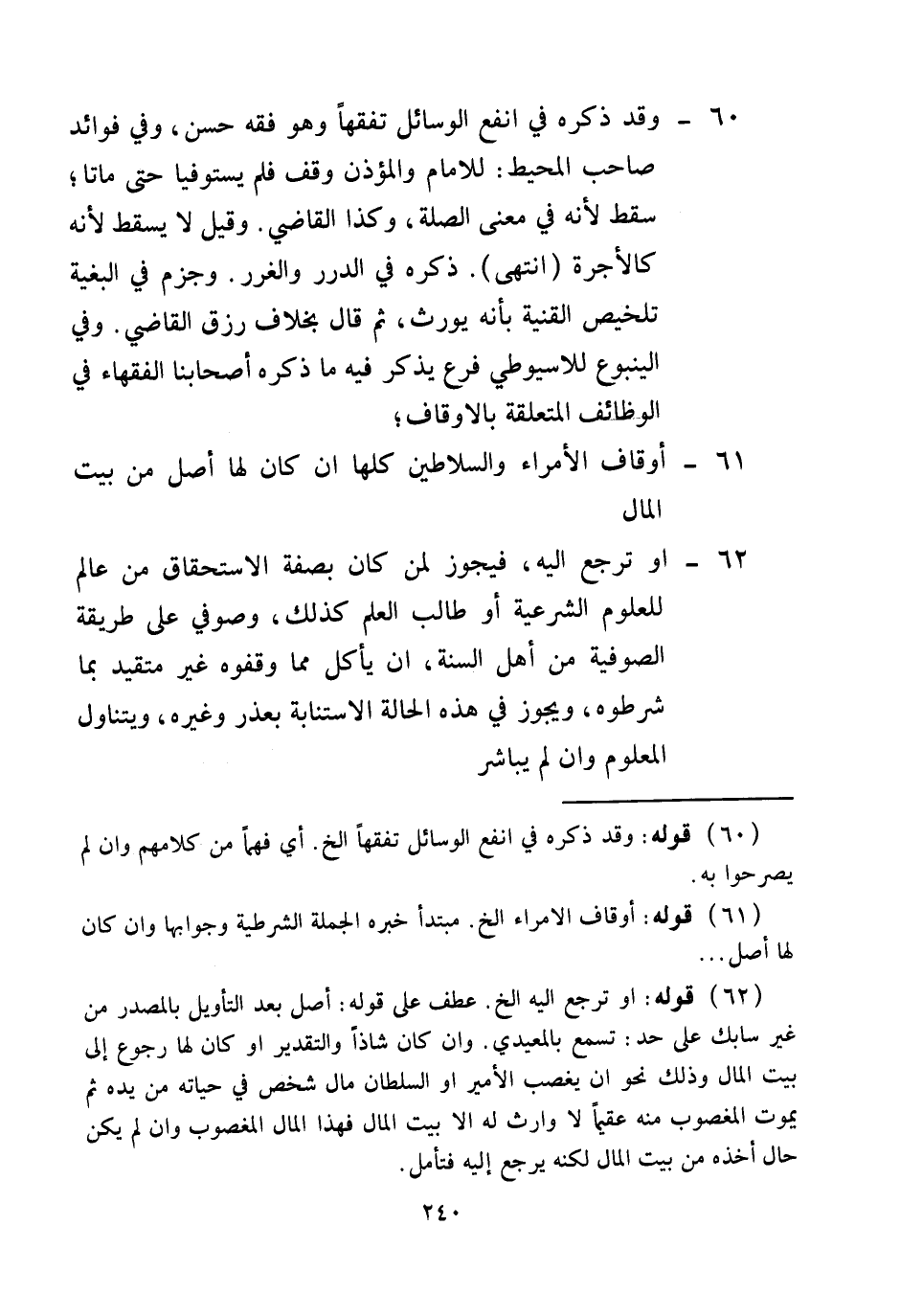 61 - أَوْقَافُ الْأُمَرَاءِ وَالسَّلَاطِينِ كُلُّهَا إنْ كَانَ لَهَا أَصْلٌ مِنْ بَيْتِ الْمَالِ 62 - أَوْ تَرْجِعُ إلَيْهِ، فَيَجُوزُ لِمَنْ كَانَ بِصِفَةِ الِاسْتِحْقَاقِ مِنْ عَالِمٍ لِلْعُلُومِ الشَّرْعِيَّةِ أَوْ طَالِبِ الْعِلْمِ كَذَلِكَ، وَصُوفِيٍّ عَلَى طَرِيقَةِ الصُّوفِيَّةِ مِنْ أَهْلِ السُّنَّةِ، أَنْ يَأْكُلَ مِمَّا وَقَفُوهُ غَيْرَ مُتَقَيِّدٍ بِمَا شَرَطُوهُ، وَيَجُوزُ فِي هَذِهِ الْحَالَةِ الِاسْتِنَابَةُ بِعُذْرٍ وَغَيْرِهِ، وَيَتَنَاوَلُ الْمَعْلُومَ وَإِنْ لَمْ يُبَاشِرْ