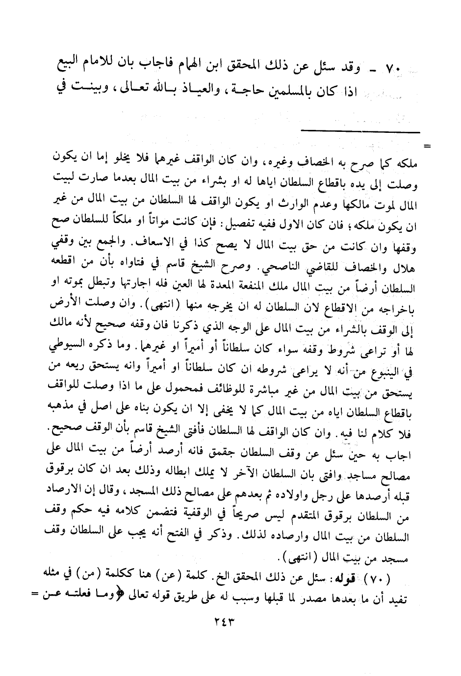70 - وَقَدْ سُئِلَ عَنْ ذَلِكَ الْمُحَقِّقُ ابْنُ الْهُمَامِ فَأَجَابَ بِأَنَّ لِلْإِمَامِ الْبَيْعَ إذَا كَانَ بِالْمُسْلِمِينَ حَاجَةٌ، وَالْعِيَاذُ بِاَللَّهِ تَعَالَى، وَبَيَّنْت فِي