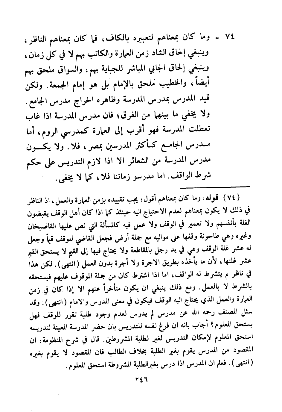 74 - وَمَا كَانَ بِمَعْنَاهُمْ لِتَعْبِيرِهِ بِالْكَافِ، فَمَا كَانَ بِمَعْنَاهُمْ النَّاظِرُ، وَيَنْبَغِي إلْحَاقُ الشَّادِّ زَمَنَ الْعِمَارَةِ وَالْكَاتِبِ بِهِمْ لَا فِي كُلِّ زَمَانٍ، وَيَنْبَغِي إلْحَاقُ الْجَابِي الْمُبَاشِرِ لِلْجِبَايَةِ بِهِمْ، وَالسَّوَّاقُ مُلْحَقٌ بِهِمْ أَيْضًا، وَالْخَطِيبُ مُلْحَقٌ بِالْإِمَامِ بَلْ هُوَ إمَامُ الْجُمُعَةِ وَلَكِنْ قَيَّدَ الْمُدَرِّسَ بِمُدَرِّسِ الْمَدْرَسَةِ وَظَاهِرُهُ إخْرَاجُ مُدَرِّسِ الْجَامِعِ وَلَا يَخْفَى مَا بَيْنَهُمَا مِنْ الْفَرْقِ؛ فَإِنَّ مُدَرِّسَ الْمَدْرَسَةِ إذَا غَابَ تَعَطَّلَتْ الْمَدْرَسَةُ فَهُوَ أَقْرَبُ إلَى الْعِمَارَةِ كَمُدَرِّسِي الرُّومِ، أَمَّا مُدَرِّسُ الْجَامِعِ كَأَكْثَرِ الْمُدَرِّسِينَ بِمِصْرَ، فَلَا وَلَا يَكُونُ مُدَرِّسُ الْمَدْرَسَةِ مِنْ الشَّعَائِرِ إلَّا إذَا لَازَمَ التَّدْرِيسَ عَلَى حُكْمِ شَرْطِ الْوَاقِفِ أَمَّا مُدَرِّسُو زَمَانِنَا فَلَا، كَمَا لَا يَخْفَى.