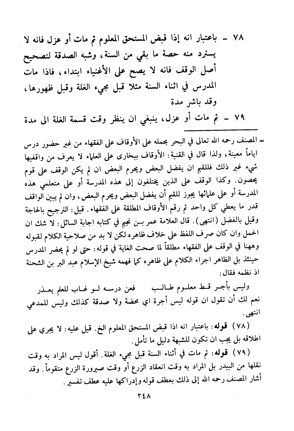 قَالَ الْعَلَّامَةُ عُمَرُ بْنُ نُجَيْمٍ فِي كِتَابِهِ إجَابَةُ السَّائِلِ: لَا شَكَّ أَنَّ الْحَمْلَ وَإِنْ كَانَ صَرَفَ اللَّفْظَ عَلَى خِلَافِ ظَاهِرِهِ لَكِنْ لَا بُدَّ مِنْ صَلَاحِيَّةِ الْكَلَامِ لِقَبُولِهِ وَهَهُنَا فِي الْوَقْفِ عَلَى الْفُقَهَاءِ مُطْلَقًا لَمَّا صَحَّتْ الْغَايَةُ فِي قَوْلِهِ: حَتَّى لَوْ لَمْ يَحْضُرْ الْمُدَرِّسُ حِينَئِذٍ بَلْ الظَّاهِرُ إجْرَاءُ الْكَلَامِ عَلَى ظَاهِرِهِ كَمَا فَهِمَهُ شَيْخُ الْإِسْلَامِ عَبْدُ الْبَرِّ بْنُ الشِّحْنَةِ إذْ نَظَمَهُ فَقَالَ: