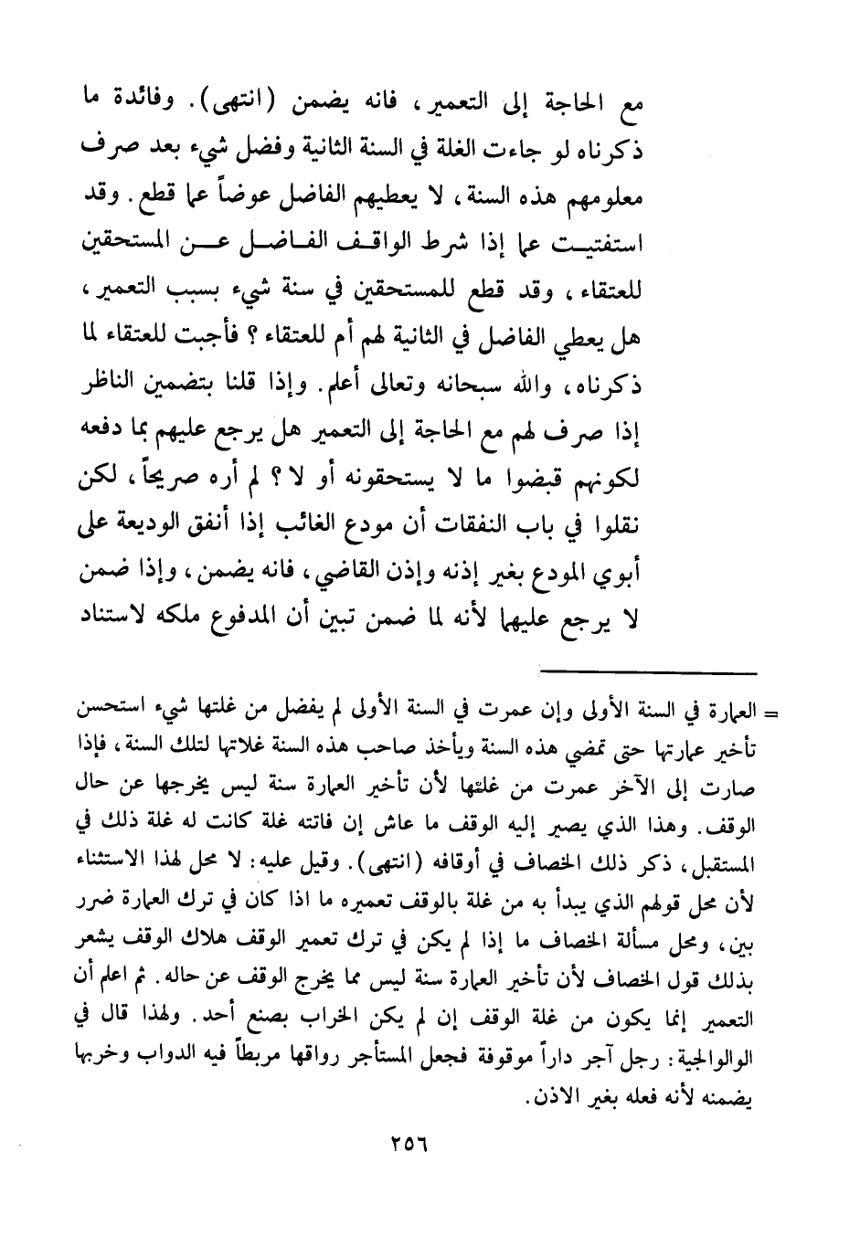 ـــــــــــــــــــــــــــــQالْعِمَارَةِ فِي السَّنَةِ الْأُولَى وَإِنْ عُمِّرَتْ فِي السَّنَةِ الْأُولَى لَمْ يَفْضُلْ مِنْ غَلَّتِهَا شَيْءٌ اُسْتُحْسِنَ تَأْخِيرُ عِمَارَتِهَا حَتَّى تَمْضِيَ هَذِهِ السَّنَةُ وَيَأْخُذَ صَاحِبُ هَذِهِ السَّنَةِ غَلَّاتِهَا لِتِلْكَ السَّنَةِ، فَإِذَا صَارَتْ إلَى الْآخِرِ عُمِّرَتْ مِنْ غَلَّتِهَا؛ لِأَنَّ تَأْخِيرَ الْعِمَارَةِ سَنَةً لَيْسَ يُخْرِجُهَا عَنْ حَالِ الْوَقْفِ. وَهَذَا الَّذِي يَصِيرُ إلَيْهِ الْوَقْفُ مَا عَاشَ إنْ فَاتَتْهُ غَلَّةٌ كَانَتْ لَهُ غَلَّةُ ذَلِكَ فِي الْمُسْتَقْبَلِ، ذَكَرَ ذَلِكَ الْخَصَّافُ فِي أَوْقَافِهِ (انْتَهَى) . وَقِيلَ عَلَيْهِ: لَا مَحَلَّ لِهَذَا الِاسْتِثْنَاءِ؛ لِأَنَّ مَحَلَّ قَوْلِهِمْ الَّذِي يَبْدَأُ بِهِ مِنْ غَلَّةٍ بِالْوَقْفِ تَعْمِيرُهُ مَا إذَا كَانَ فِي تَرْكِ الْعِمَارَةِ ضَرَرٌ بَيِّنٌ، وَمَحَلُّ مَسْأَلَةِ الْخَصَّافِ مَا إذَا لَمْ يَكُنْ فِي تَرْكِ تَعْمِيرِ الْوَقْفِ هَلَاكُ الْوَقْفِ، يُشْعِرُ بِذَلِكَ قَوْلُ الْخَصَّافِ؛ لِأَنَّ تَأْخِيرَ الْعِمَارَةِ سَنَةً لَيْسَ مِمَّا يُخْرِجُ الْوَقْفَ عَنْ حَالِهِ.