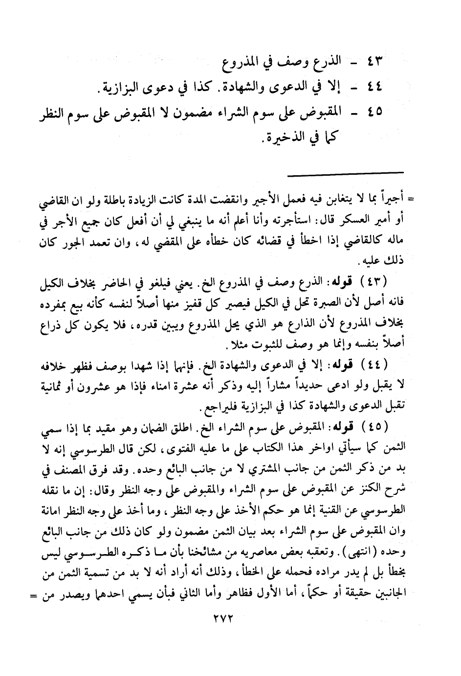 45 - الْمَقْبُوضُ عَلَى سَوْمِ الشِّرَاءِ مَضْمُونٌ لَا الْمَقْبُوضُ عَلَى سَوْمِ النَّظَرِ كَمَا فِي الذَّخِيرَةِ.