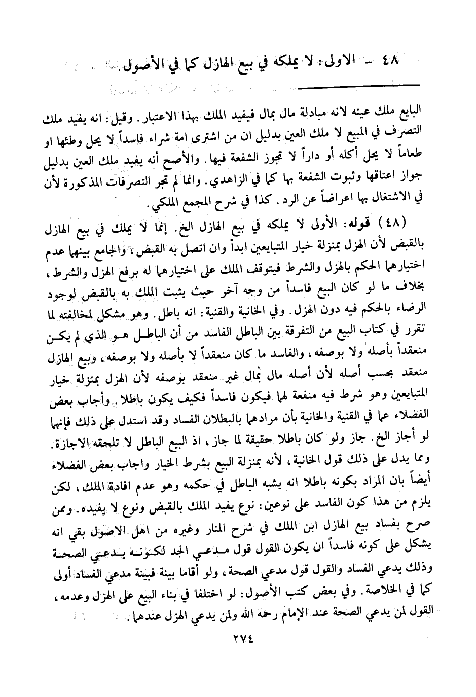 (48) قَوْلُهُ: الْأُولَى لَا يَمْلِكُهُ فِي بَيْعِ الْهَازِلِ إلَخْ. إنَّمَا لَا يَمْلِكُ فِي بَيْعِ الْهَازِلِ بِالْقَبْضِ؛ لِأَنَّ الْهَزْلَ بِمَنْزِلَةِ خِيَارِ الْمُتَبَايِعَيْنِ أَبَدًا وَإِنْ اتَّصَلَ بِهِ الْقَبْضُ، وَالْجَامِعُ بَيْنَهُمَا عَدَمُ اخْتِيَارِهِمَا الْحُكْمَ بِالْهَزْلِ وَالشَّرْطِ فَيَتَوَقَّفُ الْمِلْكُ عَلَى اخْتِيَارِهِمَا لَهُ بِرَفْعِ الْهَزْلِ وَالشَّرْطِ، بِخِلَافِ مَا لَوْ كَانَ الْبَيْعُ فَاسِدًا مِنْ وَجْهٍ آخَرَ حَيْثُ يَثْبُتُ الْمِلْكُ بِهِ بِالْقَبْضِ لِوُجُودِ الرِّضَاءِ بِالْحُكْمِ فِيهِ دُونَ الْهَزْلِ. وَفِي الْخَانِيَّةِ وَالْقُنْيَةِ: أَنَّهُ بَاطِلٌ. وَهُوَ مُشْكِلٌ لِمُخَالَفَتِهِ لِمَا تَقَرَّرَ فِي كِتَابِ الْبَيْعِ مِنْ التَّفْرِقَةِ بَيْنَ الْبَاطِلِ وَالْفَاسِدِ مِنْ أَنَّ الْبَاطِلَ هُوَ الَّذِي لَمْ يَكُنْ مُنْعَقِدًا بِأَصْلِهِ وَلَا بِوَصْفِهِ، وَالْفَاسِدَ مَا كَانَ مُنْعَقِدًا لَا بِأَصْلِهِ وَلَا بِوَصْفِهِ، وَبَيْعُ الْهَازِلِ مُنْعَقِدٌ بِحَسَبِ أَصْلِهِ؛ - لِأَنَّ أَصْلَهُ مَالٌ بِمَالٍ، - غَيْرُ مُنْعَقِدٍ بِوَصْفِهِ؛ لِأَنَّ الْهَزْلَ بِمَنْزِلَةِ خِيَارِ الْمُتَبَايِعَيْنِ وَهُوَ شَرْطٌ فِيهِ مَنْفَعَةٌ لَهُمَا فَيَكُونُ فَاسِدًا فَكَيْفَ يَكُونُ بَاطِلًا. وَأَجَابَ بَعْضُ الْفُضَلَاءِ عَمَّا فِي الْقُنْيَةِ وَالْخَانِيَّةِ بِأَنَّ مُرَادَهُمَا بِالْبُطْلَانِ الْفَسَادُ وَقَدْ اُسْتُدِلَّ عَلَى ذَلِكَ فَإِنَّهُمَا لَوْ أَجَازَا إلَخْ جَازَ وَلَوْ كَانَ بَاطِلًا حَقِيقَةً لَمَا جَازَ، إذْ الْبَيْعُ الْبَاطِلُ لَا تَلْحَقُهُ الْإِجَازَةُ وَمِمَّا يَدُلُّ عَلَى ذَلِكَ قَوْلُ الْخَانِيَّةِ: لِأَنَّهُ بِمَنْزِلَةِ الْبَيْعِ بِشَرْطِ الْخِيَارِ. وَأَجَابَ بَعْضُ الْفُضَلَاءِ أَيْضًا بِأَنَّ الْمُرَادَ بِكَوْنِهِ بَاطِلًا أَنَّهُ يُشْبِهُ الْبَاطِلَ فِي حُكْمِهِ وَهُوَ عَدَمُ إفَادَةِ الْمِلْكِ، لَكِنْ يَلْزَمُ مِنْ هَذَا كَوْنُ الْفَاسِدِ عَلَى نَوْعَيْنِ: نَوْعٌ يُفِيدُ الْمِلْكَ بِالْقَبْضِ وَنَوْعٌ لَا يُفِيدُهُ. وَمِمَّنْ صَرَّحَ بِفَسَادِ بَيْعِ الْهَازِلِ ابْنُ الْمَلِكِ فِي شَرْحِ الْمَنَارِ وَغَيْرُهُ مِنْ أَهْلِ الْأُصُولِ، بَقِيَ أَنَّهُ يُشْكِلُ عَلَى كَوْنِهِ فَاسِدًا أَنْ يَكُونَ الْقَوْلُ قَوْلَ مُدَّعِي الْجِدِّ لِكَوْنِهِ يَدَّعِي الصِّحَّةَ وَذَلِكَ يَدَّعِي الْفَسَادَ وَالْقَوْلُ قَوْلُ مُدَّعِي الصِّحَّةِ، وَلَوْ أَقَامَا بَيِّنَةً فَبَيِّنَةُ مُدَّعِي الْفَسَادِ أَوْلَى كَمَا فِي الْخُلَاصَةِ. وَفِي بَعْضِ كُتُبِ الْأُصُولِ: لَوْ اخْتَلَفَا فِي بِنَاءِ الْبَيْعِ عَلَى الْهَزْلِ وَعَدَمِهِ، الْقَوْلُ لِمَنْ يَدَّعِي الصِّحَّةَ عِنْدَ الْإِمَامِ - رَحِمَهُ اللَّهُ - وَلِمَنْ يَدَّعِي الْهَزْلَ عِنْدَهُمَا.