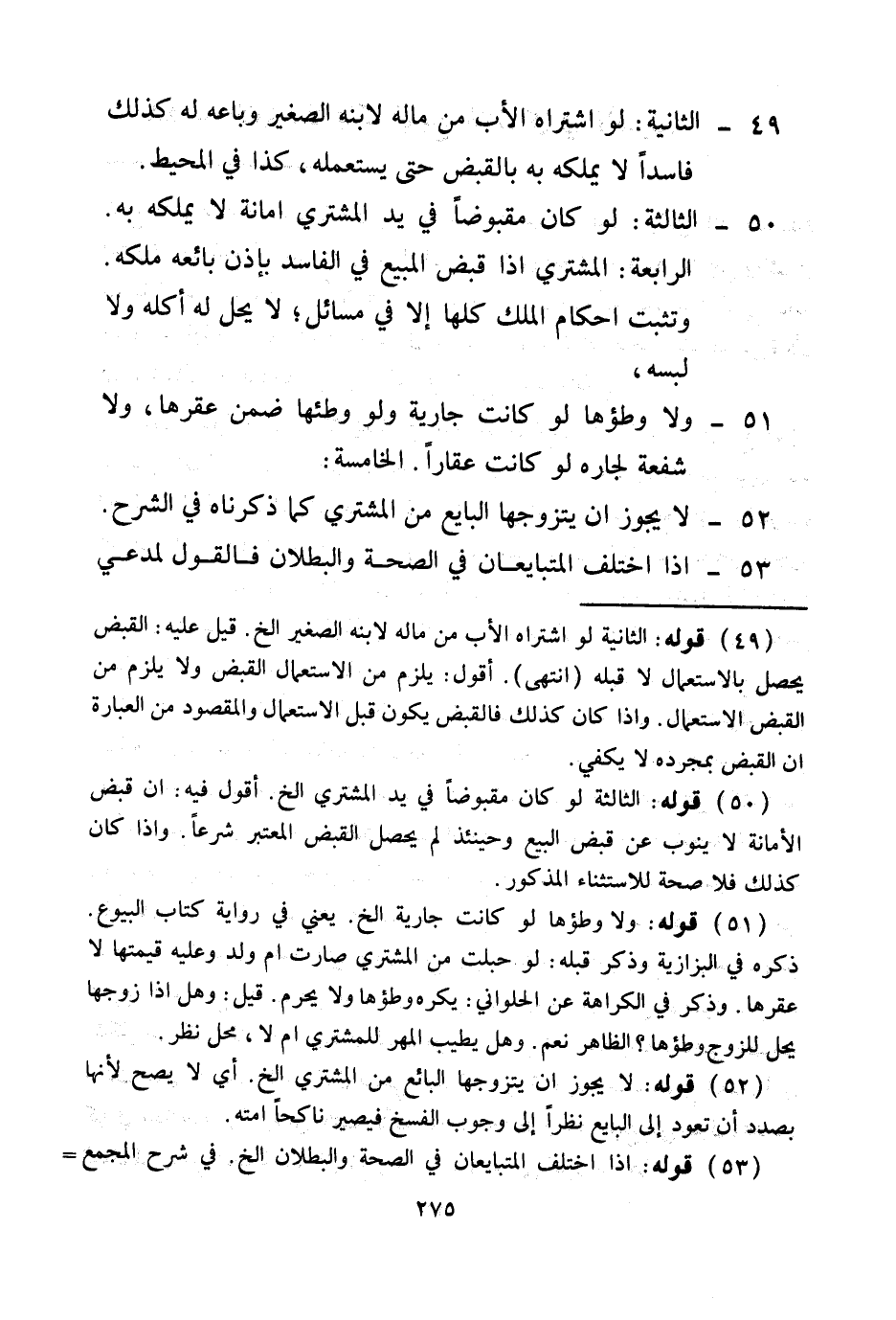 50 - الثَّالِثَةُ: لَوْ كَانَ مَقْبُوضًا فِي يَدِ الْمُشْتَرِي أَمَانَةً لَا يَمْلِكُهُ بِهِ. الرَّابِعَةُ: الْمُشْتَرِي إذَا قَبَضَ الْمَبِيعَ فِي الْفَاسِدِ بِإِذْنِ بَائِعِهِ مَلَكَهُ. وَتَثْبُتُ أَحْكَامُ الْمِلْكِ كُلُّهَا إلَّا فِي مَسَائِلَ؛ لَا يَحِلُّ لَهُ أَكْلُهُ وَلَا لُبْسُهُ، 51 - وَلَا وَطْؤُهَا لَوْ كَانَتْ جَارِيَةً وَلَوْ وَطِئَهَا ضَمِنَ عُقْرَهَا، وَلَا شُفْعَةَ لِجَارِهِ لَوْ كَانَتْ عَقَارًا. الْخَامِسَةُ: 52 - لَا يَجُوزُ أَنْ يَتَزَوَّجَهَا الْبَائِعُ مِنْ الْمُشْتَرِي كَمَا ذَكَرْنَاهُ فِي الشَّرْحِ.