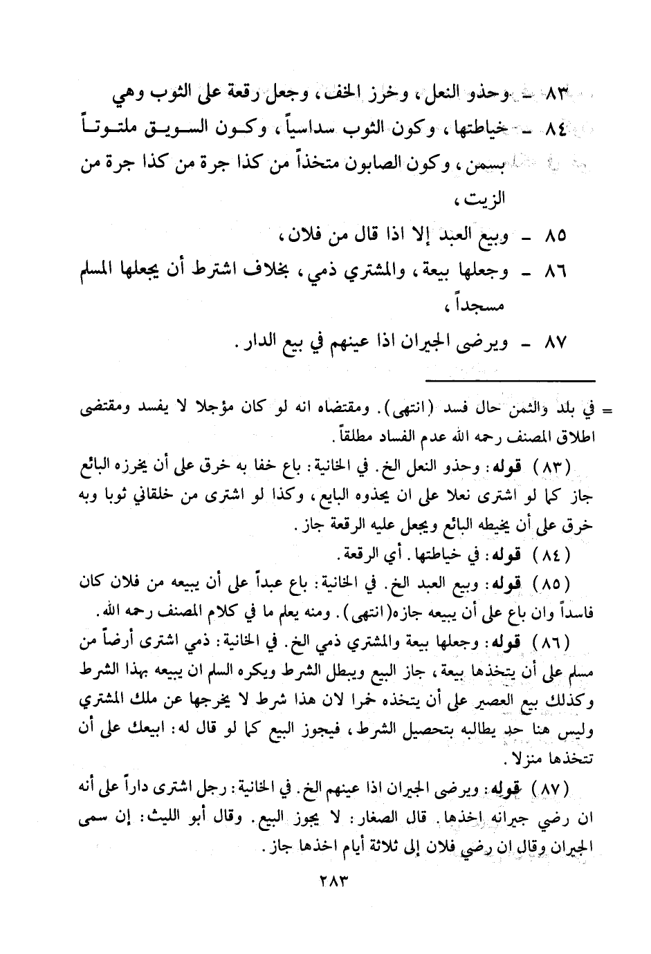 وَحَذْوُ النَّعْلِ، وَخَرَزُ الْخُفِّ، وَجَعْلُ رُقْعَةٍ عَلَى الثَّوْبِ وَهِيَ 84 - خِيَاطَتُهَا، وَكَوْنُ الثَّوْبِ سُدَاسِيًّا، وَكَوْنُ السَّوِيقِ مَلْتُوتًا بِسَمْنٍ، وَكَوْنُ الصَّابُونِ مُتَّخَذًا مِنْ كَذَا جَرَّةٍ مِنْ الزَّيْتِ