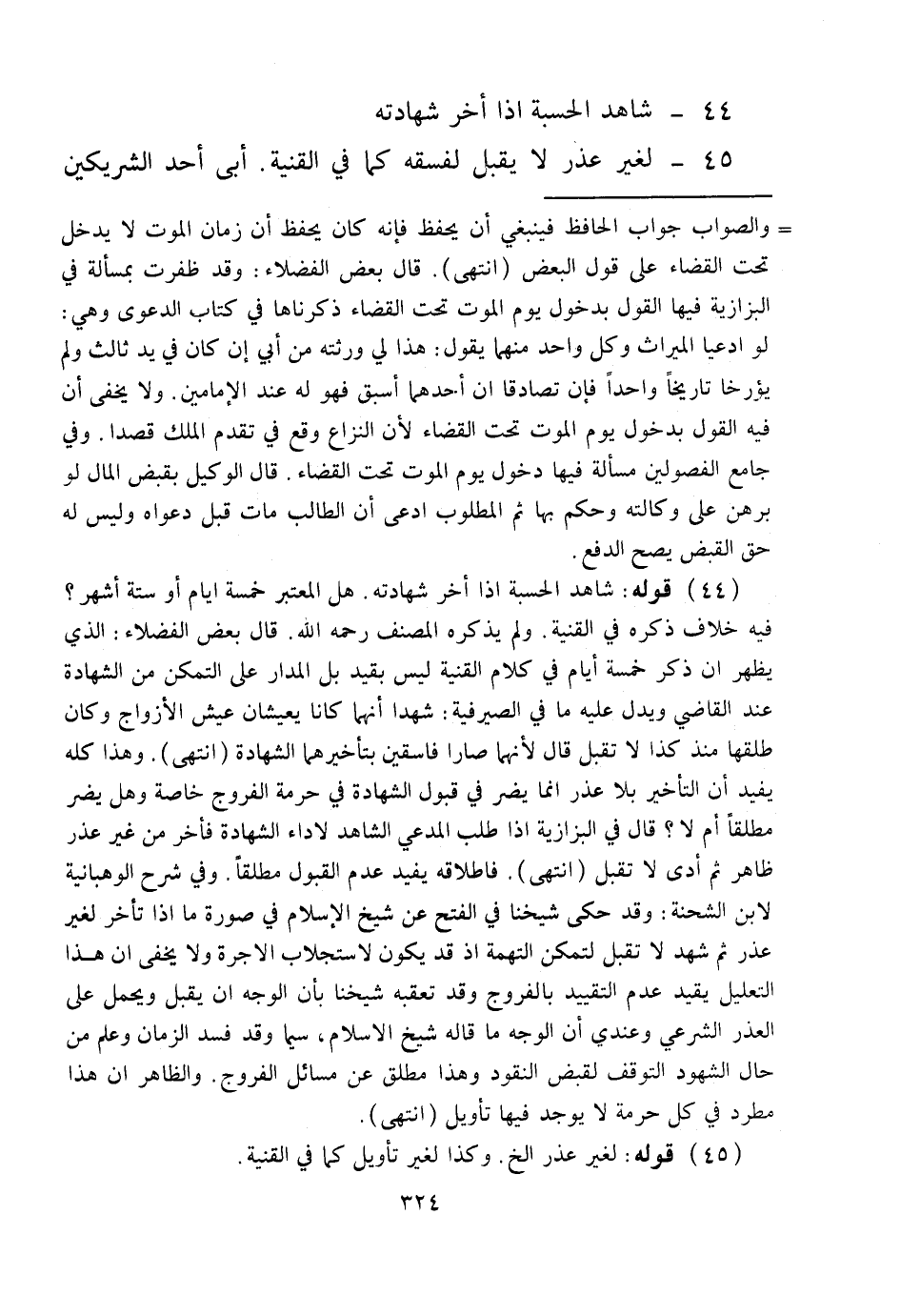 (44) قَوْلُهُ: شَاهِدُ الْحِسْبَةِ إذَا أَخَّرَ شَهَادَتَهُ. هَلْ الْمُعْتَبَرُ خَمْسَةُ أَيَّامٍ أَوْ سِتَّةُ أَشْهُرٍ؟ فِيهِ خِلَافٌ ذَكَرَهُ فِي الْقُنْيَةِ. وَلَمْ يَذْكُرْهُ الْمُصَنِّفُ - رَحِمَهُ اللَّهُ -. قَالَ بَعْضُ الْفُضَلَاءِ: الَّذِي يَظْهَرُ أَنَّ ذِكْرَ خَمْسَةِ أَيَّامٍ فِي كَلَامِ الْقُنْيَةِ لَيْسَ بِقَيْدٍ بَلْ الْمَدَارُ عَلَى التَّمَكُّنِ مِنْ الشَّهَادَةِ عِنْدَ الْقَاضِي، وَيَدُلُّ عَلَيْهِ مَا فِي الصَّيْرَفِيَّةِ: شَهِدَا أَنَّهُمَا كَانَا يَعِيشَانِ عَيْشَ الْأَزْوَاجِ وَكَانَ طَلَّقَهَا مُنْذُ كَذَا لَا تُقْبَلُ قَالَ: لِأَنَّهُمَا صَارَا فَاسِقَيْنِ بِتَأْخِيرِهِمَا الشَّهَادَةَ (انْتَهَى) .