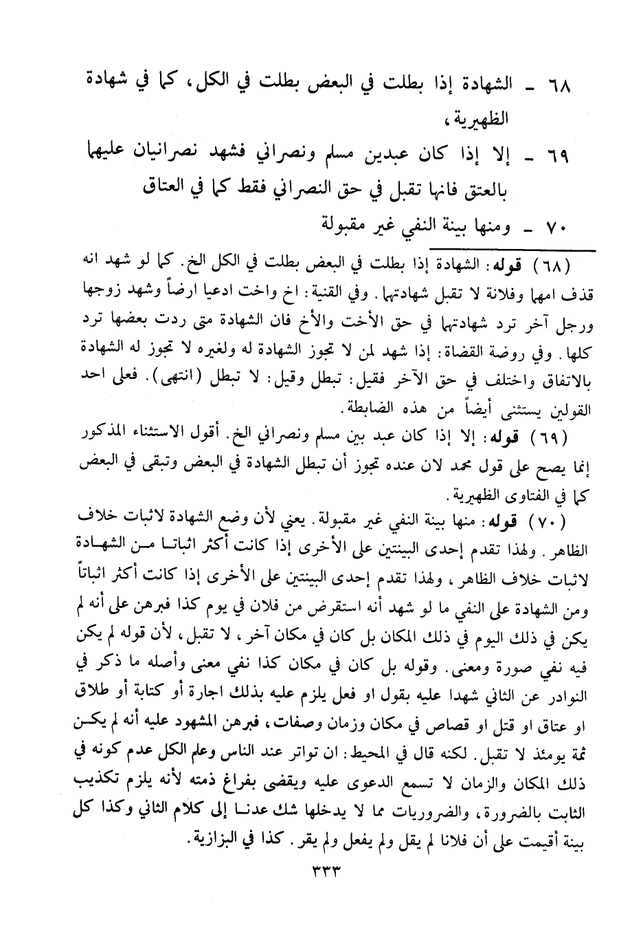 الشَّهَادَةُ إذَا بَطَلَتْ فِي الْبَعْضِ بَطَلَتْ فِي الْكُلِّ، كَمَا فِي شَهَادَةِ الظَّهِيرِيَّةِ، 69 - إلَّا إذَا كَانَ عَبْدَيْنِ مُسْلِمٌ وَنَصْرَانِيٌّ فَشَهِدَ نَصْرَانِيَّانِ عَلَيْهِمَا بِالْعِتْقِ فَإِنَّهَا تُقْبَلُ فِي حَقِّ النَّصْرَانِيِّ فَقَطْ كَمَا فِي الْعَتَاقِ
