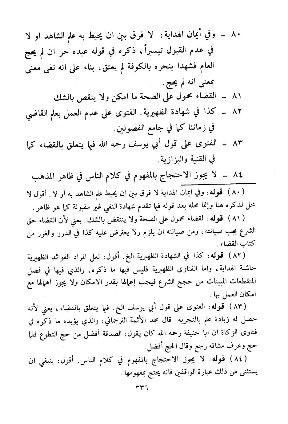 (84) قَوْلُهُ: لَا يَجُوزُ الِاحْتِجَاجُ بِالْمَفْهُومِ فِي كَلَامِ النَّاسِ. أَقُولُ: يَنْبَغِي أَنْ يُسْتَثْنَى مِنْ ذَلِكَ عِبَارَةُ الْوَاقِفِينَ فَإِنَّهُ يُحْتَجُّ بِمَفْهُومِهَا.