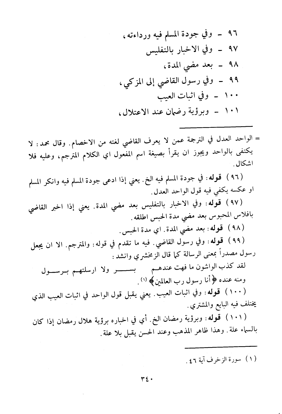 وَفِي جُودَةِ الْمُسْلَمِ فِيهِ وَرَدَاءَتِهِ، 97 - وَفِي الْإِخْبَارِ بِالتَّفْلِيسِ 98 - بَعْدَ مُضِيِّ الْمُدَّةِ، 99 - وَفِي رَسُولِ الْقَاضِي إلَى الْمُزَكِّي 100 - وَفِي إثْبَاتِ الْعَيْبِ 101 - وَبِرُؤْيَةِ رَمَضَانَ عِنْدَ الِاعْتِلَالِ،