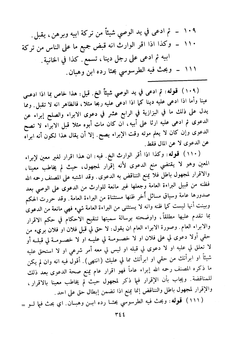 110 - وَكَذَا إذَا أَقَرَّ الْوَارِثُ أَنَّهُ قَبَضَ جَمِيعَ مَا عَلَى النَّاسِ مِنْ تَرِكَةِ أَبِيهِ ثُمَّ ادَّعَى عَلَى رَجُلٍ دَيْنًا، تُسْمَعُ. كَذَا فِي الْخَانِيَّةِ. 111 - وَبَحَثَ فِيهِ الطَّرَسُوسِيُّ بَحْثًا رَدَّهُ ابْنُ وَهْبَانَ