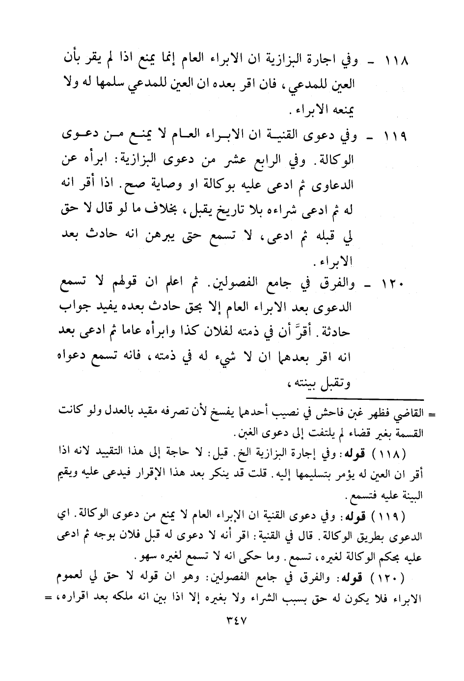 119 - وَفِي دَعْوَى الْقُنْيَةِ أَنَّ الْإِبْرَاءَ الْعَامَّ لَا يَمْنَعُ مِنْ دَعْوَى الْوَكَالَةِ. وَفِي الرَّابِعِ عَشَرَ مِنْ دَعْوَى الْبَزَّازِيَّةِ: أَبْرَأَهُ عَنْ الدَّعَاوَى ثُمَّ ادَّعَى عَلَيْهِ بِوَكَالَةٍ أَوْ وِصَايَةٍ صَحَّ. إذَا أَقَرَّ أَنَّهُ لَهُ ثُمَّ ادَّعَى شِرَاءَهُ بِلَا تَارِيخٍ يُقْبَلُ، بِخِلَافِ مَا لَوْ قَالَ: لَا حَقَّ لِي قِبَلَهُ ثُمَّ ادَّعَى، لَا تُسْمَعُ حَتَّى يُبَرْهِنَ أَنَّهُ حَادِثٌ بَعْدَ الْإِبْرَاءِ. 120 - وَالْفَرْقُ فِي جَامِعِ الْفُصُولَيْنِ. ثُمَّ اعْلَمْ أَنَّ قَوْلَهُمْ لَا تُسْمَعُ الدَّعْوَى بَعْدَ الْإِبْرَاءِ الْعَامِّ إلَّا بِحَقٍّ حَادِثٍ بَعْدَهُ يُفِيدُ جَوَابَ حَادِثَةٍ