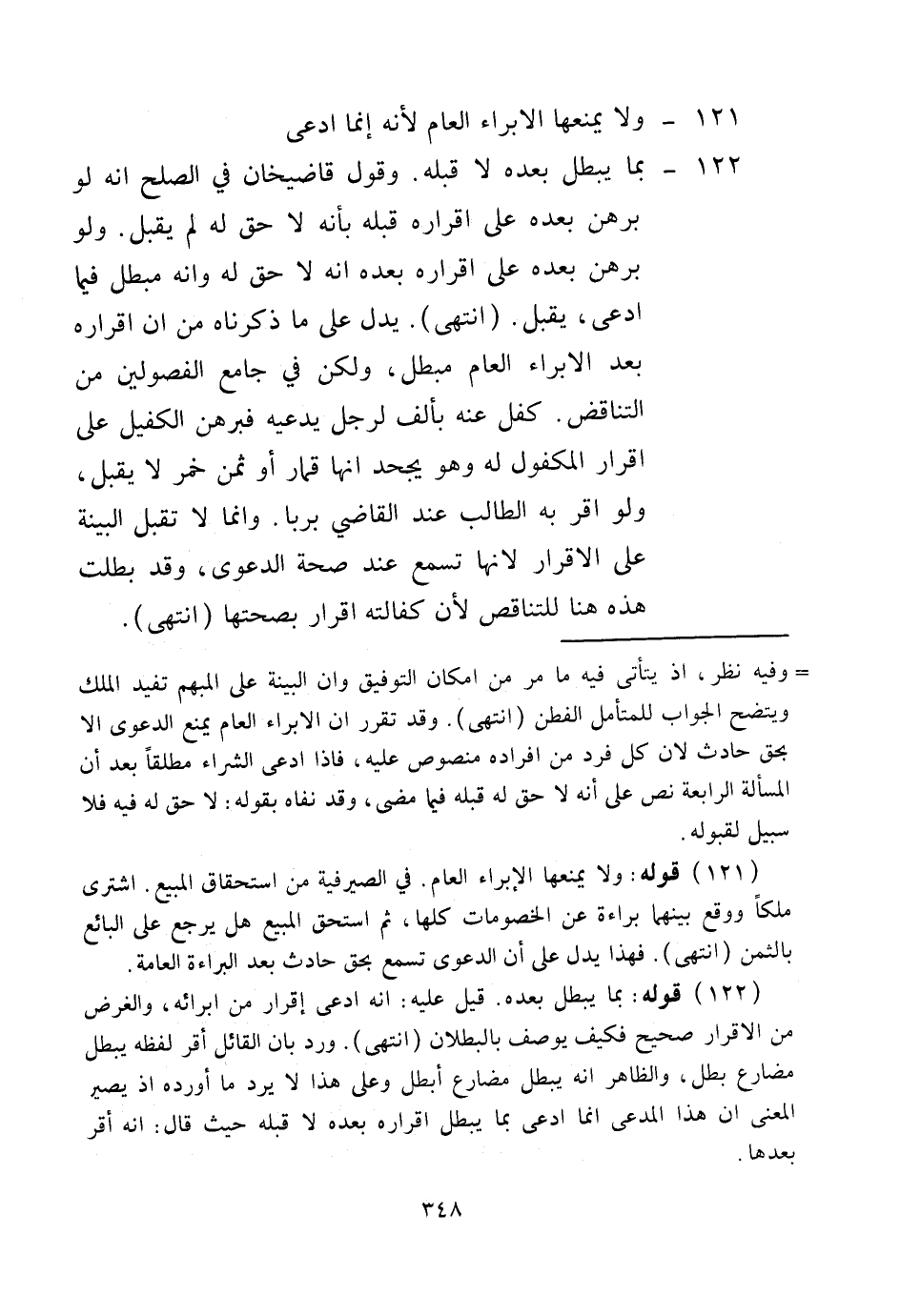 (122) قَوْلُهُ: بِمَا يَبْطُلُ بَعْدَهُ. قِيلَ عَلَيْهِ: أَنَّهُ ادَّعَى إقْرَارًا مِنْ إبْرَائِهِ، وَالْغَرَضُ مِنْ الْإِقْرَارِ صَحِيحٌ فَكَيْفَ يُوصَفُ بِالْبُطْلَانِ (انْتَهَى) .
