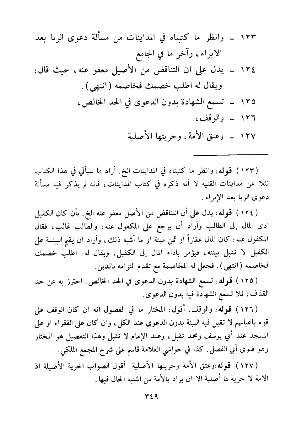 (125) قَوْلُهُ: تُسْمَعُ الشَّهَادَةُ بِدُونِ الدَّعْوَى فِي الْحَدِّ الْخَالِصِ. احْتَرَزَ بِهِ عَنْ حَدِّ الْقَذْفِ، فَلَا تُسْمَعُ الشَّهَادَةُ فِيهِ بِدُونِ الدَّعْوَى. (126) قَوْلُهُ: وَالْوَقْفُ. أَقُولُ: الْمُخْتَارُ مَا فِي الْفُصُولِ أَنَّهُ إنْ كَانَ الْوَقْفُ عَلَى قَوْمٍ بِأَعْيَانِهِمْ لَا تُقْبَلُ فِيهِ الْبَيِّنَةُ بِدُونِ الدَّعْوَى عِنْدَ الْكُلِّ، وَإِنْ كَانَ عَلَى الْفُقَرَاءِ أَوْ عَلَى الْمَسْجِدِ عِنْدَ أَبِي يُوسُفَ وَمُحَمَّدٍ تُقْبَلُ، وَعِنْدَ الْإِمَامِ لَا تُقْبَلُ، وَهَذَا التَّفْصِيلُ هُوَ الْمُخْتَارُ، وَهُوَ فَتْوَى أَبِي الْفَضْلِ. كَذَا فِي حَوَاشِي الْعَلَّامَةِ قَاسِمٍ عَلَى شَرْحِ الْمَجْمَعِ الْمَلَكِيِّ.