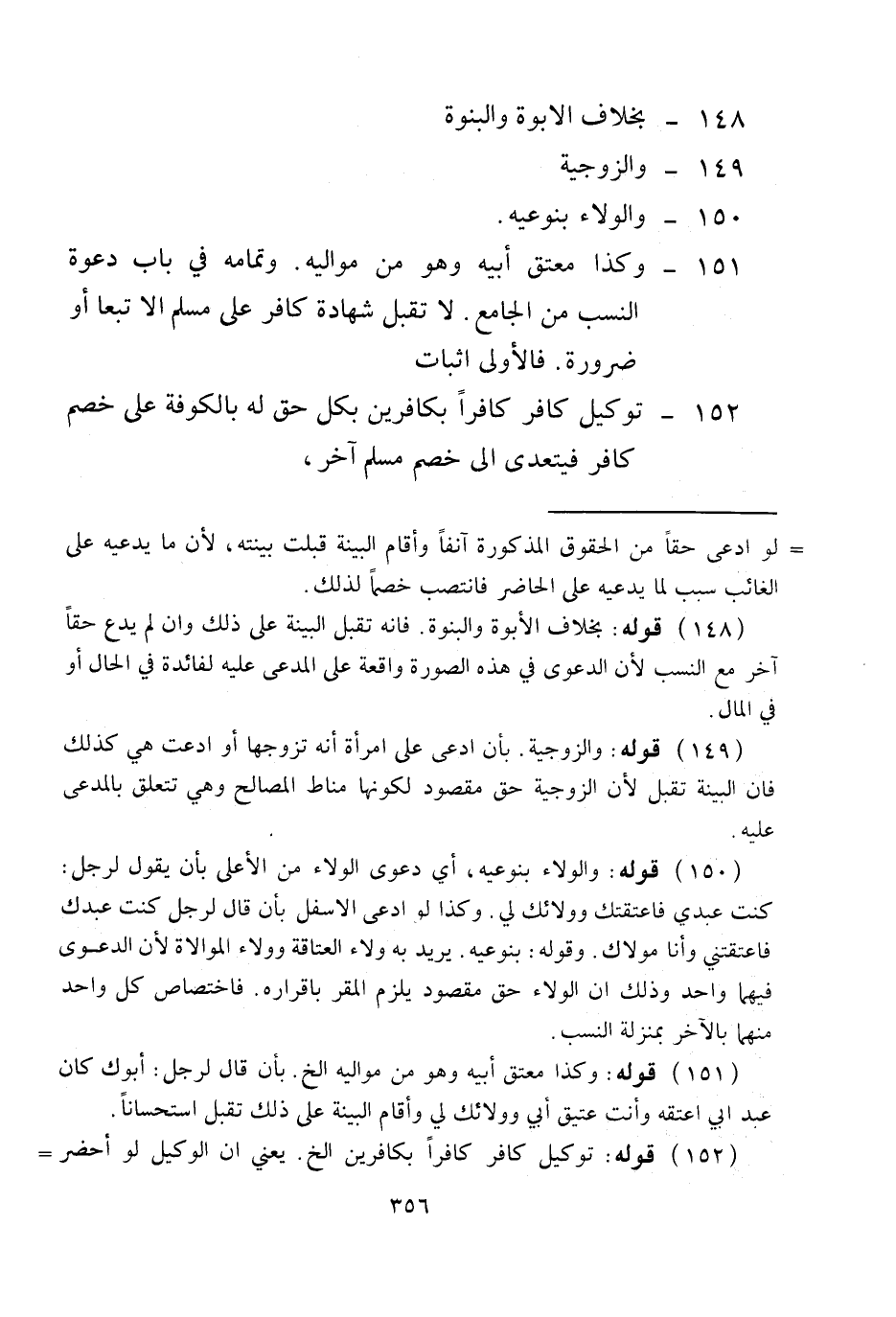 (150) قَوْلُهُ: وَالْوَلَاءِ بِنَوْعَيْهِ، أَيْ دَعْوَى الْوَلَاءِ مِنْ الْأَعْلَى بِأَنْ يَقُولَ لِرَجُلٍ: كُنْت عَبْدِي فَأَعْتَقْتُك وَوَلَائِك لِي. وَكَذَا لَوْ ادَّعَى الْأَسْفَلَ بِأَنْ قَالَ لِرَجُلٍ: كُنْتُ عَبْدُك فَأَعْتَقَتْنِي، وَأَنَا مَوْلَاك. وَقَوْلُهُ: بِنَوْعَيْهِ يُرِيدُ بِهِ وَلَاءَ الْعَتَاقَةِ وَوَلَاءَ الْمُوَالَاةِ؛ لِأَنَّ الدَّعْوَى فِيهِمَا وَاحِدٌ، وَذَلِكَ أَنَّ الْوَلَاءَ حَقٌّ مَقْصُودٌ يَلْزَمُ الْمُقِرَّ بِإِقْرَارِهِ. فَاخْتِصَاصُ كُلِّ وَاحِدٍ مِنْهُمَا بِالْآخَرِ بِمَنْزِلَةِ النَّسَبِ. (151) قَوْلُهُ: وَكَذَا مُعْتَقُ أَبِيهِ، وَهُوَ مِنْ مَوَالِيهِ إلَخْ. بِأَنْ قَالَ لِرَجُلٍ: أَبُوك كَانَ عَبْدُ أَبِي أَعْتَقَهُ وَأَنْتَ عَتِيقُ أَبِي وَوَلَائِك لِي، وَأَقَامَ الْبَيِّنَةَ عَلَى ذَلِكَ تُقْبَلُ اسْتِحْسَانًا