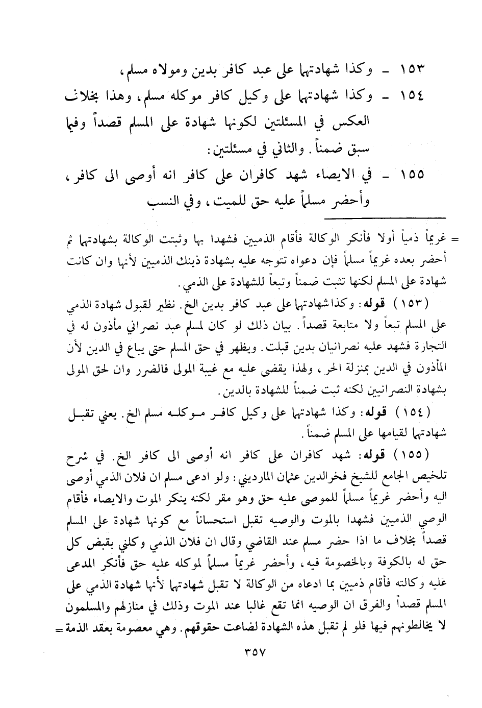154 - وَكَذَا شَهَادَتُهُمَا عَلَى وَكِيلٍ كَافِرٍ مُوَكِّلُهُ مُسْلِمٌ، وَهَذَا بِخِلَافِ الْعَكْسِ فِي الْمَسْأَلَتَيْنِ لِكَوْنِهَا شَهَادَةً عَلَى الْمُسْلِمِ قَصْدًا، وَفِيمَا سَبَقَ ضِمْنًا.