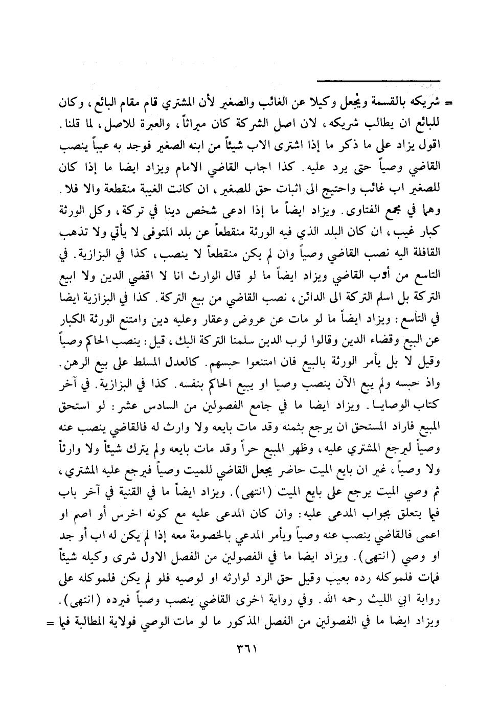 وَيُزَادُ أَيْضًا مَا فِي الْفُصُولَيْنِ مِنْ الْفَصْلِ الْأَوَّلِ شَرَى وَكِيلُهُ شَيْئًا فَمَاتَ فَلِمُوَكِّلِهِ رَدُّهُ بِعَيْبٍ، وَقِيلَ حَقُّ الرَّدِّ لِوَارِثِهِ أَوْ لِوَصِيِّهِ فَلَوْ لَمْ يَكُنْ فَلِمُوَكِّلِهِ عَلَى رِوَايَةِ أَبِي اللَّيْثِ - رَحِمَهُ اللَّهُ -. وَفِي رِوَايَةٍ أُخْرَى الْقَاضِي يَنْصِبُ وَصِيًّا فَيَرُدُّهُ (انْتَهَى) .