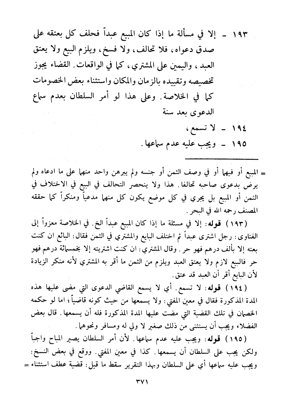 (194) قَوْلُهُ: لَا تُسْمَعُ. أَيْ لَا يَسْمَعُ الْقَاضِي الدَّعْوَى الَّتِي مَضَى عَلَيْهَا هَذِهِ الْمُدَّةُ الْمَذْكُورَةُ فَقَالَ فِي مُعِينِ الْمُفْتِي: وَلَا يَسْمَعُهَا مِنْ حَيْثُ كَوْنِهِ قَاضِيًا؛ أَمَّا لَوْ حَكَّمَهُ الْخَصْمَانِ فِي تِلْكَ الْقَضِيَّةِ الَّتِي مَضَتْ عَلَيْهَا الْمُدَّةُ الْمَذْكُورَةُ فَلَهُ أَنْ يَسْمَعَهَا. قَالَ بَعْضُ الْفُضَلَاءِ: وَيَجِبُ أَنْ يُسْتَثْنَى مِنْ ذَلِكَ صَغِيرٌ لَا وَلِيَّ لَهُ وَمُسَافِرٌ وَنَحْوُهُمَا (195) قَوْلُهُ: وَيَجِبُ عَلَيْهِ عَدَمُ سَمَاعِهَا.؛ لِأَنَّ أَمْرَ السُّلْطَانِ يُصَيِّرُ الْمُبَاحَ وَاجِبًا وَلَكِنْ يَجِبُ عَلَى السُّلْطَانِ أَنْ يَسْمَعَهَا. كَذَا فِي مُعِينِ الْمُفْتِي. وَوَقَعَ فِي بَعْضِ النُّسَخِ: وَيَجِبُ عَلَيْهِ سَمَاعُهَا أَيْ عَلَى السُّلْطَانِ، وَبِهَذَا التَّقْرِيرِ سَقَطَ مَا قِيلَ: قَضِيَّةُ عَطْفِ اسْتِثْنَاءِ