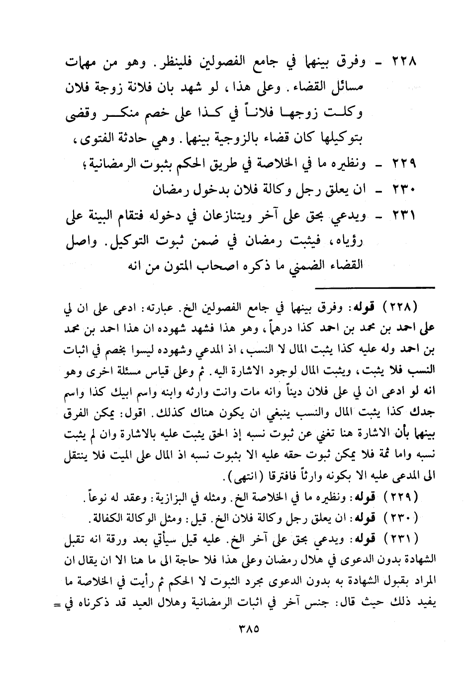229 - وَنَظِيرُهُ مَا فِي الْخُلَاصَةِ فِي طَرِيقِ الْحُكْمِ بِثُبُوتِ الرَّمَضَانِيَّةِ؛ 230 - أَنْ يُعَلِّقَ رَجُلٌ وَكَالَةَ فُلَانٍ بِدُخُولِ رَمَضَانَ 231 - وَيَدَّعِي بِحَقٍّ عَلَى آخَرَ وَيَتَنَازَعَانِ فِي دُخُولِهِ فَتُقَامُ الْبَيِّنَةُ عَلَى رُؤْيَاهُ، فَيَثْبُتُ رَمَضَانُ فِي ضِمْنِ ثُبُوتِ التَّوْكِيلِ.