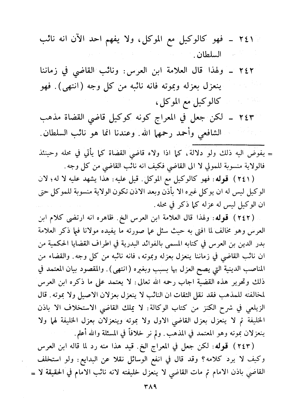 فَهُوَ كَالْوَكِيلِ مَعَ الْمُوَكِّلِ، وَلَا يَفْهَمُ أَحَدٌ الْآنَ أَنَّهُ نَائِبُ السُّلْطَانِ. 242 - وَلِهَذَا قَالَ الْعَلَّامَةُ ابْنُ الْغَرْسِ: وَنَائِبُ الْقَاضِي فِي زَمَانِنَا يَنْعَزِلُ بِعَزْلِهِ وَبِمَوْتِهِ فَإِنَّهُ نَائِبُهُ مِنْ كُلِّ وَجْهٍ (انْتَهَى) .