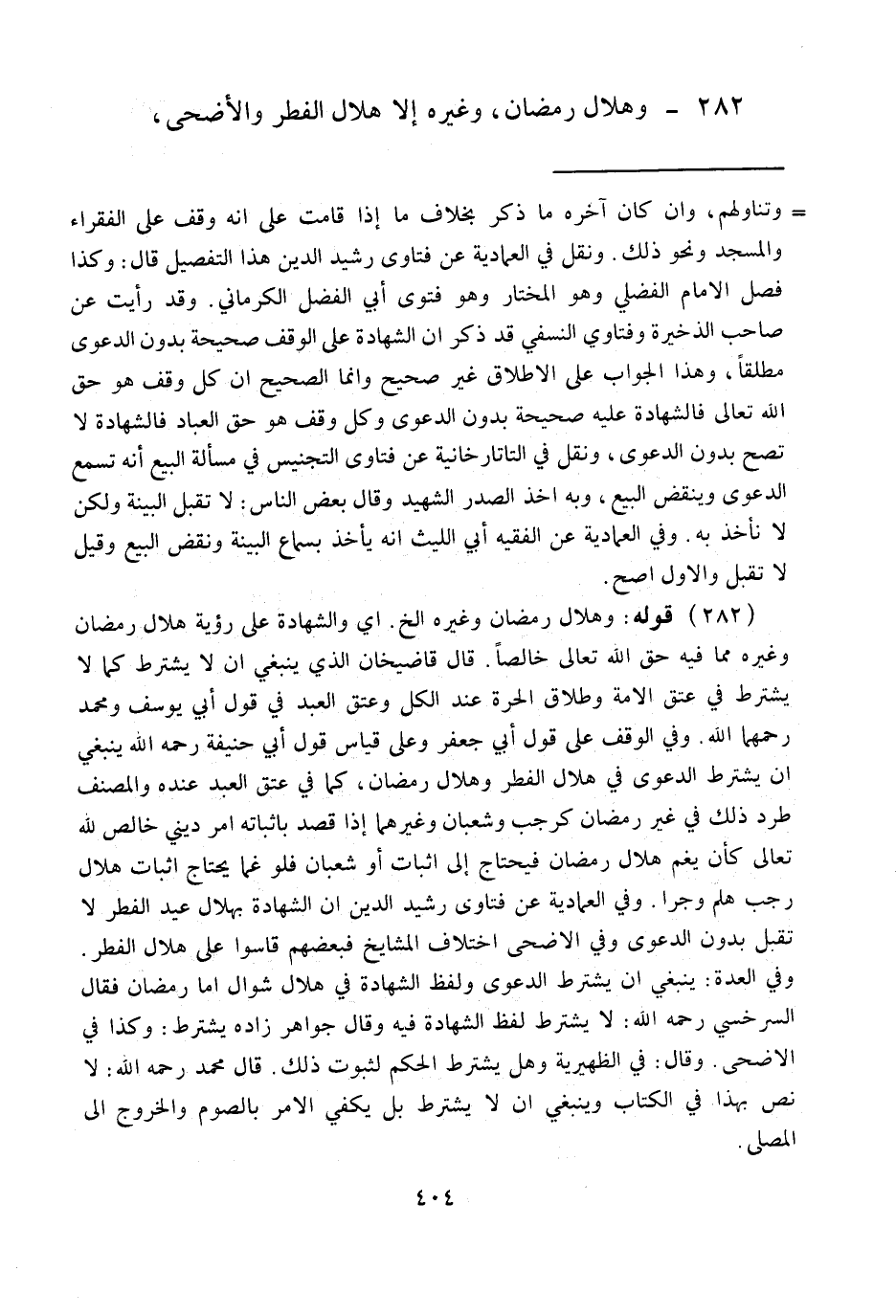 وَفِي الْعِمَادِيَّةِ عَنْ الْفَقِيهِ أَبِي اللَّيْثِ أَنَّهُ يَأْخُذُ بِسَمَاعِ الْبَيِّنَةِ وَنَقْضِ الْبَيْعِ وَقِيلَ لَا تُقْبَلُ وَالْأَوَّلُ أَصَحُّ. (282) قَوْلُهُ: وَهِلَالِ رَمَضَانَ وَغَيْرِهِ إلَخْ. أَيْ وَالشَّهَادَةُ عَلَى رُؤْيَةِ هِلَالِ رَمَضَانَ وَغَيْرِهِ مِمَّا فِيهِ حَقُّ اللَّهِ تَعَالَى خَالِصًا. قَالَ قَاضِي خَانْ الَّذِي يَنْبَغِي أَنْ لَا يُشْتَرَطُ كَمَا لَا يُشْتَرَطُ فِي عِتْقِ الْأَمَةِ وَطَلَاقِ الْحُرَّةِ عِنْدَ الْكُلِّ وَعِتْقِ الْعَبْدِ فِي قَوْلِ أَبِي يُوسُفَ وَمُحَمَّدٍ رَحِمَهُمَا اللَّهُ. وَفِي الْوَقْفِ عَلَى قَوْلِ أَبِي جَعْفَرٍ وَعَلَى قِيَاسِ قَوْلِ أَبِي حَنِيفَةَ - رَحِمَهُ اللَّهُ - يَنْبَغِي أَنْ يُشْتَرَطَ الدَّعْوَى فِي هِلَالِ الْفِطْرِ وَهِلَالِ رَمَضَانَ، كَمَا فِي عِتْقِ الْعَبْدِ عِنْدَهُ وَالْمُصَنِّفُ طَرَدَ ذَلِكَ فِي غَيْرِ رَمَضَانَ كَرَجَبٍ وَشَعْبَانَ وَغَيْرِهِمَا إذَا قُصِدَ بِإِثْبَاتِهِ أَمْرٌ دِينِيٌّ خَالِصٌ لِلَّهِ تَعَالَى كَأَنْ يُغَمَّ هِلَالُ رَمَضَانَ فَيُحْتَاجَ إلَى إثْبَاتٍ أَوْ شَعْبَانَ فَلَوْ غَمَّا يَحْتَاجُ إثْبَاتُ هِلَالِ رَجَبٍ، وَهَلُمَّ جَرَّا. وَفِي الْعِمَادِيَّةِ عَنْ فَتَاوَى رَشِيدِ الدِّينِ أَنَّ الشَّهَادَةَ بِهِلَالِ عِيدِ الْفِطْرِ لَا تُقْبَلُ بِدُونِ الدَّعْوَى، وَفِي الْأَضْحَى اخْتِلَافُ الْمَشَايِخِ فَبَعْضُهُمْ قَاسُوا عَلَى هِلَالِ الْفِطْرِ. وَفِي الْعُدَّةِ: يَنْبَغِي أَنْ يُشْتَرَطَ الدَّعْوَى وَلَفْظُ الشَّهَادَةِ فِي هِلَالِ شَوَّالٍ أَمَّا رَمَضَانُ فَقَالَ السَّرَخْسِيُّ - رَحِمَهُ اللَّهُ -: لَا يُشْتَرَطُ لَفْظُ الشَّهَادَةِ فِيهِ وَقَالَ خُوَاهَرْ زَادَهُ يُشْتَرَطُ: وَكَذَا فِي الْأَضْحَى. وَقَالَ: فِي الظَّهِيرِيَّةِ وَهَلْ يُشْتَرَطُ الْحُكْمُ لِثُبُوتِ ذَلِكَ. قَالَ مُحَمَّدٌ - رَحِمَهُ اللَّهُ -: لَا نَصَّ بِهَذَا فِي الْكِتَابِ وَيَنْبَغِي أَنْ لَا يُشْتَرَطَ بَلْ يَكْفِي الْأَمْرُ بِالصَّوْمِ وَالْخُرُوجُ إلَى الْمُصَلَّى.