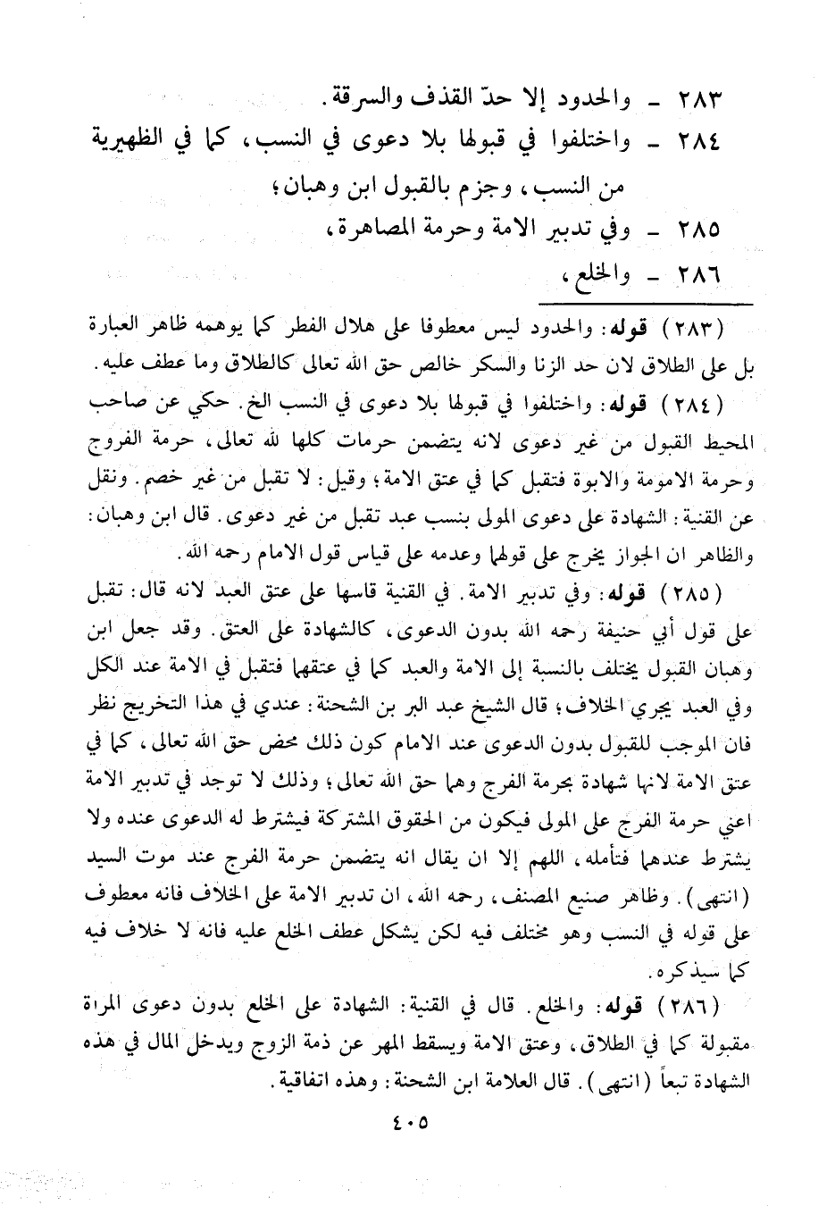 وَالْحُدُودِ إلَّا حَدَّ الْقَذْفِ وَالسَّرِقَةِ. 284 - وَاخْتَلَفُوا فِي قَبُولِهَا بِلَا دَعْوَى فِي النَّسَبِ كَمَا فِي الظَّهِيرِيَّةِ مِنْ النَّسَبِ، وَجَزَمَ بِالْقَبُولِ ابْنُ وَهْبَانَ، 285 - وَفِي تَدْبِيرِ الْأَمَةِ وَحُرْمَةِ الْمُصَاهَرَةِ، 286 - وَالْخُلْعِ،