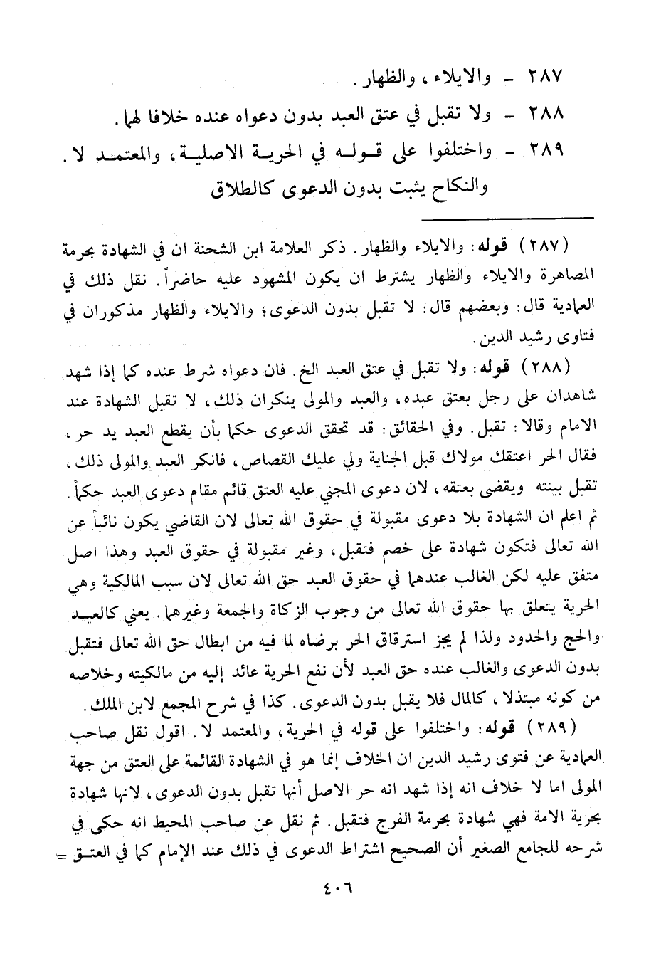 وَالْإِيلَاءِ، وَالظِّهَارِ 288 - وَلَا تُقْبَلُ فِي عِتْقِ الْعَبْدِ بِدُونِ دَعْوَاهُ عِنْدَهُ خِلَافًا لَهُمَا. 289 - وَاخْتَلَفُوا عَلَى قَوْلِهِ فِي الْحُرِّيَّةِ الْأَصْلِيَّةِ، وَالْمُعْتَمَدُ لَا.