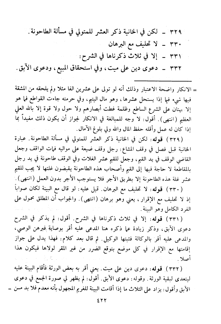 330 - لَا تَحْلِيفَ مَعَ الْبُرْهَانِ 331 - إلَّا فِي ثَلَاثٍ ذَكَرْنَاهَا فِي الشَّرْحِ: 332 - دَعْوَى دَيْنٍ عَلَى مَيِّتٍ، وَفِي اسْتِحْقَاقِ الْمَبِيعِ، وَدَعْوَى الْآبِقِ.