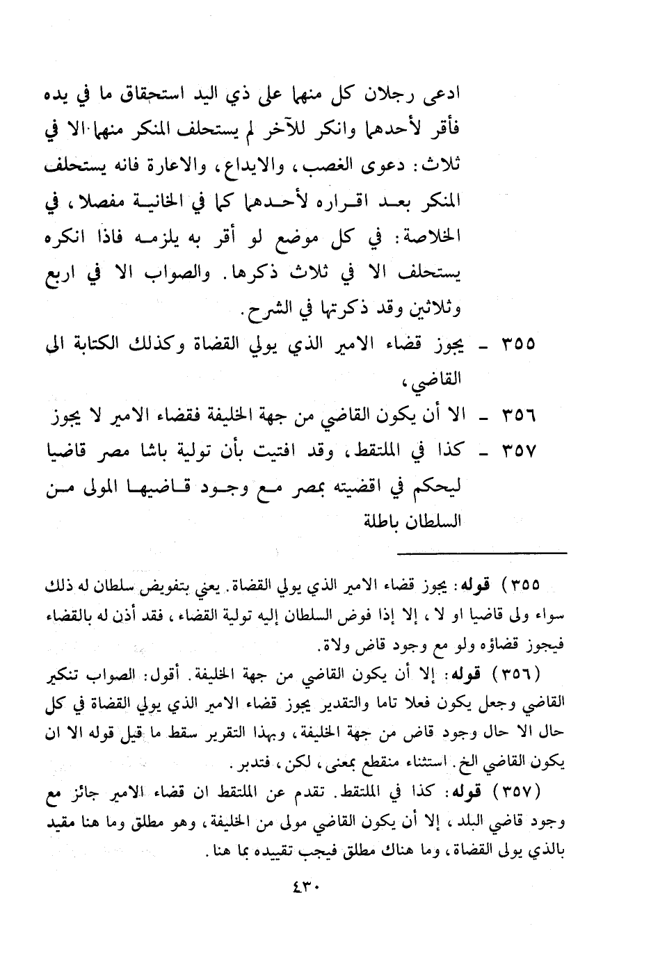 355 - يَجُوزُ قَضَاءُ الْأَمِيرِ الَّذِي يُوَلِّي الْقُضَاةَ وَكَذَلِكَ الْكِتَابَةُ إلَى الْقَاضِي، 356 - إلَّا أَنْ يَكُونَ الْقَاضِي مِنْ جِهَةِ الْخَلِيفَةِ فَقَضَاءُ الْأَمِيرِ لَا يَجُوزُ 357 - كَذَا فِي الْمُلْتَقَطِ، وَقَدْ أَفْتَيْتُ بِأَنَّ تَوْلِيَةَ بَاشَا مِصْرَ قَاضِيًا لِيَحْكُمَ فِي أَقْضِيَتِهِ بِمِصْرَ مَعَ وُجُودِ قَاضِيهَا الْمُوَلَّى مِنْ السُّلْطَانِ بَاطِلَةٌ