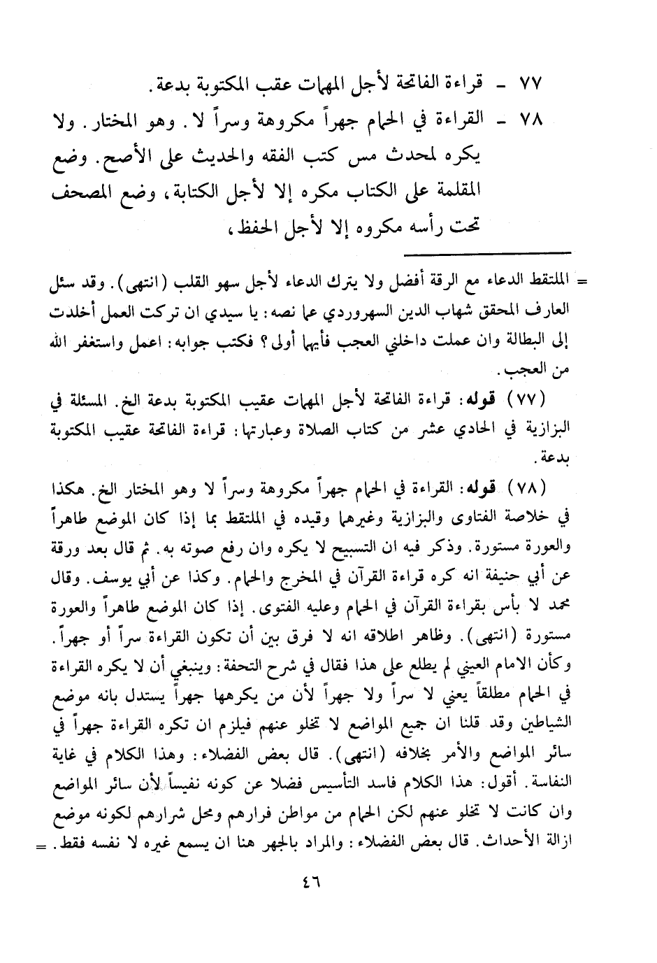 78 - الْقِرَاءَةُ فِي الْحَمَّامِ جَهْرًا مَكْرُوهَةٌ وَسِرًّا لَا. وَهُوَ الْمُخْتَارُ. وَلَا يُكْرَهُ لِمُحْدِثٍ مَسُّ كُتُبِ الْفِقْهِ وَالْحَدِيثِ عَلَى الْأَصَحِّ. وَضْعُ الْمِقْلَمَةِ عَلَى الْكِتَابِ مَكْرُوهٌ إلَّا لِأَجْلِ الْكِتَابَةِ، وَضْعُ الْمُصْحَفِ تَحْتَ رَأْسِهِ مَكْرُوهٌ إلَّا لِأَجْلِ الْحِفْظِ،