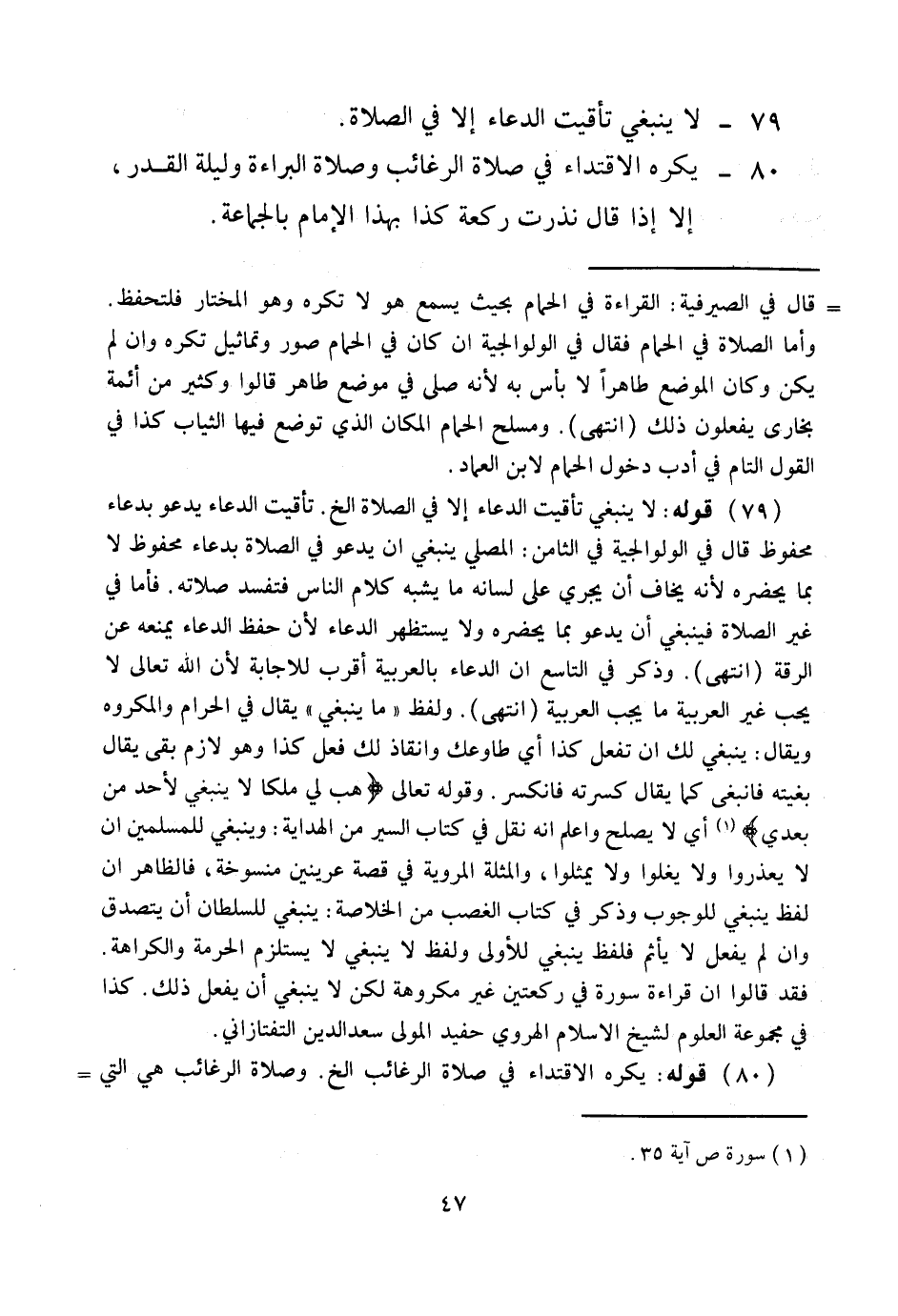 80 - يُكْرَهُ الِاقْتِدَاءُ فِي صَلَاةِ الرَّغَائِبِ وَصَلَاةِ الْبَرَاءَةِ وَلَيْلَةِ الْقَدْرِ، إلَّا إذَا قَالَ نَذَرْتُ رَكْعَةَ كَذَا بِهَذَا الْإِمَامِ بِالْجَمَاعَةِ.
