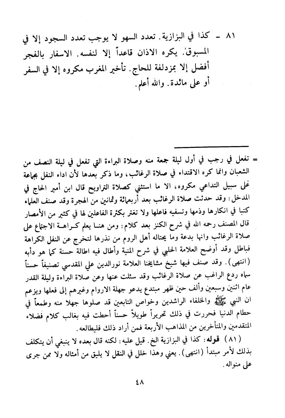 ـــــــــــــــــــــــــــــQتُفْعَلُ فِي رَجَبٍ فِي أَوَّلِ لَيْلَةِ جُمُعَةٍ مِنْهُ وَصَلَاةُ الْبَرَاءَةِ الَّتِي تُفْعَلُ فِي لَيْلَةِ النِّصْفِ مِنْ الشَّعْبَانِ وَإِنَّمَا كَرِهَ الِاقْتِدَاءَ فِي صَلَاةِ الرَّغَائِبِ، وَمَا ذَكَرَ بَعْدَهَا لِأَنَّ أَدَاءَ النَّفْلِ بِجَمَاعَةٍ عَلَى سَبِيلِ التَّدَاعِي مَكْرُوهٌ، إلَّا مَا اُسْتُثْنِيَ كَصَلَاةِ التَّرَاوِيحِ قَالَ ابْنُ أَمِيرِ الْحَاجِّ فِي الْمَدْخَلِ: وَقَدْ حَدَثَتْ صَلَاةُ الرَّغَائِبِ بَعْدَ أَرْبَعِمِائَةٍ وَثَمَانِينَ مِنْ الْهِجْرَةِ وَقَدْ صَنَّفَ الْعُلَمَاءُ كُتُبًا فِي إنْكَارِهَا وَذَمِّهَا وَتَسْفِيهِ فَاعِلِهَا وَلَا تَغْتَرَّ بِكَثْرَةِ الْفَاعِلِينَ لَهَا فِي كَثِيرِ مِنْ الْأَمْصَارِ قَالَ الْمُصَنِّفُ - رَحِمَهُ اللَّهُ - فِي شَرْحِ الْكَنْزِ بَعْدَ كَلَامٍ: وَمِنْ هُنَا يُعْلَمُ كَرَاهَةُ الِاجْتِمَاعِ عَلَى صَلَاةِ الرَّغَائِبِ وَأَنَّهَا بِدْعَةٌ وَمَا يَحْتَالُهُ أَهْلُ الرُّومِ مِنْ نَذْرِهَا لِتَخْرُجَ عَنْ النَّفْلِ الْكَرَاهَةُ فَبَاطِلٌ وَقَدْ أَوْضَحَ الْعَلَّامَةُ الْحَلَبِيُّ فِي شَرْحِ الْمُنْيَةِ وَأَطَالَ فِيهِ إطَالَةً حَسَنَةً كَمَا هُوَ دَأْبُهُ (انْتَهَى) . وَقَدْ صَنَّفَ فِيهَا شَيْخُ مَشَايِخِنَا الْعَلَّامَةُ نُورُ الدِّينِ عَلِيٌّ الْمَقْدِسِيُّ تَصْنِيفًا حَسَنًا سَمَّاهُ رَدْعَ الرَّاغِبِ عَنْ صَلَاةِ الرَّغَائِبِ وَقَدْ سُئِلْتُ عَنْهَا وَعَنْ صَلَاةِ الْبَرَاءَةِ وَلَيْلَةِ الْقَدْرِ عَامَ اثْنَيْنِ وَسَبْعِينَ وَأَلْفٍ حِينَ ظَهَرَ مُبْتَدِعٌ يَدْعُو جَهَلَةَ الْأَرْوَامِ وَغَيْرَهُمْ إلَى فِعْلِهَا وَيَزْعُمُ أَنَّ النَّبِيَّ - صَلَّى اللَّهُ عَلَيْهِ وَسَلَّمَ - وَالْخُلَفَاءَ الرَّاشِدِينَ وَخَوَاصَّ التَّابِعِينَ قَدْ صَلَّوْهَا جَهْلًا مِنْهُ وَطَمَعًا فِي حُطَامِ الدُّنْيَا فَحَرَّرْتُ فِي ذَلِكَ تَحْرِيرًا طَوِيلًا حَسَنًا أَحَطْتُ فِيهِ بِغَالِبِ كَلَامِ فُضَلَاءِ الْمُتَقَدِّمِينَ وَالْمُتَأَخِّرِينَ مِنْ الْمَذَاهِبِ الْأَرْبَعَةِ فَمَنْ أَرَادَ ذَلِكَ فَلْيُطَالِعْهُ. (81) قَوْلُهُ: كَذَا فِي الْبَزَّازِيَّةِ إلَخْ. قِيلَ عَلَيْهِ: لَكِنَّهُ قَالَ بَعْدَهُ لَا يَنْبَغِي أَنْ يَتَكَلَّفَ بِذَلِكَ لِأَمْرٍ مُبْتَدَأٍ (انْتَهَى) .