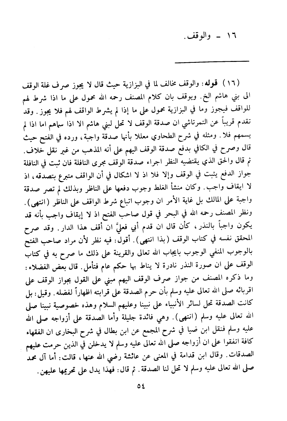 وَقَدْ تَقَدَّمَ قَرِيبًا عَنْ التُّمُرْتَاشِيِّ أَنَّ صَدَقَةَ الْوَقْفِ لَا تَحِلُّ لِبَنِي هَاشِمٍ إلَّا إذَا سَمَّاهُمْ أَمَّا إذَا لَمْ يُسَمِّهِمْ فَلَا. وَمِثْلُهُ فِي شَرْحِ الطَّحَاوِيِّ مُعَلَّلًا بِأَنَّهَا صَدَقَةٌ وَاجِبَةٌ، وَرَدَّهُ فِي الْفَتْحِ حَيْثُ قَالَ وَصَرَّحَ فِي الْكَافِي بِدَفْعِ صَدَقَةِ الْوَقْفِ إلَيْهِمْ عَلَى أَنَّ الْمَذْهَبَ مِنْ غَيْرِ نَقْلٍ خِلَافٌ. ثُمَّ قَالَ وَالْحَقُّ الَّذِي يَقْتَضِيه النَّظَرُ إجْرَاءَ صَدَقَةِ الْوَقْفِ مُجْرَى النَّافِلَةِ فَإِنْ ثَبَتَ فِي النَّافِلَةِ جَوَازُ الدَّفْعِ يَثْبُتُ فِي الْوَقْفِ وَإِلَّا فَلَا إذْ لَا إشْكَالَ فِي أَنَّ الْوَاقِفَ مُتَبَرِّعٌ بِتَصَدُّقِهِ، إذْ لَا إيقَافَ وَاجِبٍ. وَكَانَ مَنْشَأُ الْغَلَطِ وُجُوبَ دَفْعِهَا عَلَى النَّاظِرِ وَبِذَلِكَ لَمْ تَصِرْ صَدَقَةً وَاجِبَةً عَلَى الْمَالِكِ بَلْ غَايَةُ الْأَمْرِ أَنَّ وُجُوبَ اتِّبَاعِ شَرْطِ الْوَاقِفِ عَلَى النَّاظِرِ (انْتَهَى) .
