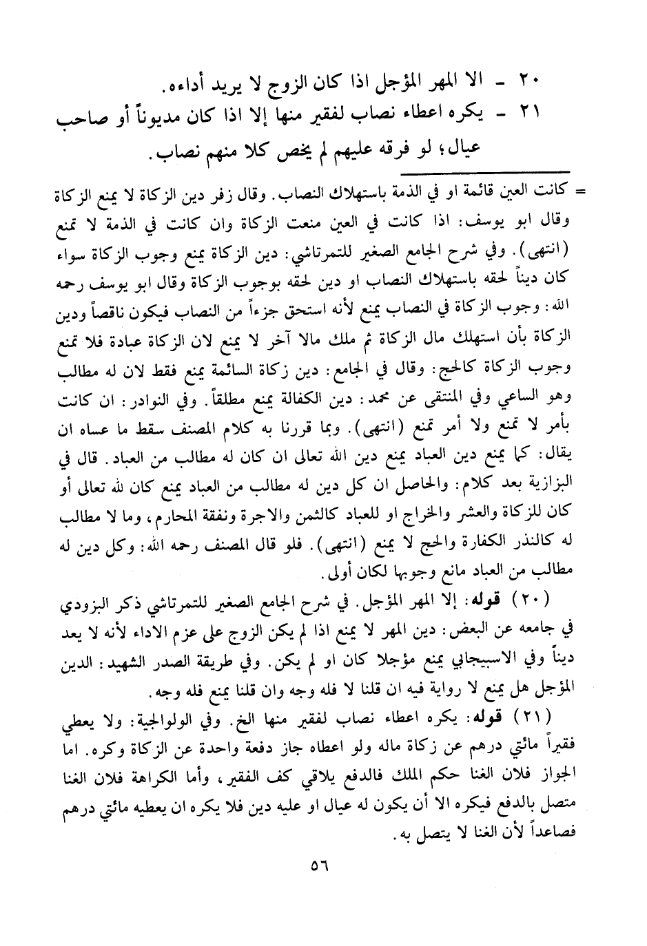 فَلَوْ قَالَ الْمُصَنِّفُ - رَحِمَهُ اللَّهُ -: وَكُلُّ دَيْنٍ لَهُ مُطَالِبٌ مِنْ الْعِبَادِ مَانِعٌ وُجُوبَهَا لَكَانَ أَوْلَى. (20) قَوْلُهُ: إلَّا الْمَهْرَ الْمُؤَجَّلَ. فِي شَرْحِ الْجَامِعِ الصَّغِيرِ لِلتُّمُرْتَاشِيِّ ذَكَر الْبَزْدَوِيُّ فِي جَامِعِهِ عَنْ الْبَعْضِ: دَيْنُ الْمَهْرِ لَا يَمْنَعُ إذَا لَمْ يَكُنْ الزَّوْجُ عَلَى عَزْمِ الْأَدَاءِ لِأَنَّهُ لَا يُعَدُّ دَيْنًا وَفِي الْإِسْبِيجَابِيِّ يَمْنَعُ مُؤَجَّلًا كَانَ أَوْ لَمْ يَكُنْ. وَفِي طَرِيقَةِ الصَّدْرِ الشَّهِيدِ: الدَّيْنُ الْمُؤَجَّلُ هَلْ يَمْنَعُ؟ لَا رِوَايَةَ فِيهِ إنْ قُلْنَا لَا فَلَهُ وَجْهٌ وَإِنْ قُلْنَا يَمْنَعُ فَلَهُ وَجْهٌ