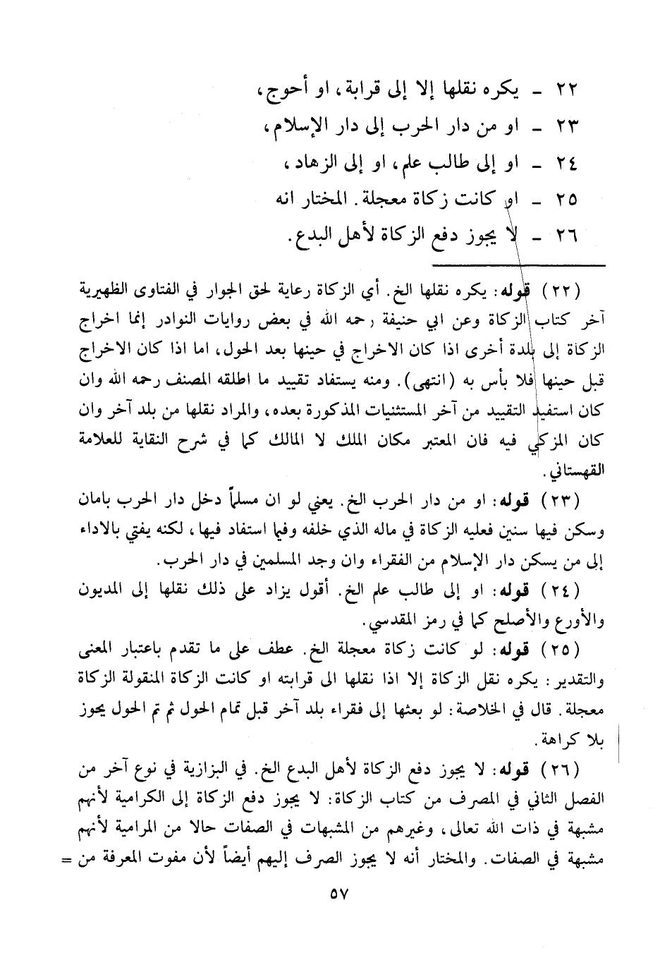يُكْرَهُ نَقْلُهَا إلَّا إلَى قَرَابَةٍ، أَوْ أَحْوَجَ، 23 - أَوْ مِنْ دَارِ الْحَرْبِ إلَى دَارِ الْإِسْلَامِ، 24 - أَوْ إلَى طَالِبِ عِلْمٍ، أَوْ إلَى الزُّهَّادِ، 25 - أَوْ كَانَتْ زَكَاةً مُعَجَّلَةً الْمُخْتَارُ أَنَّهُ