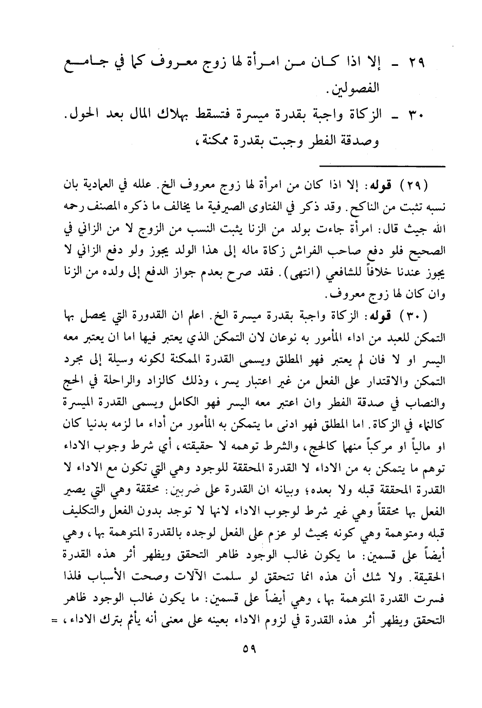 30 - الزَّكَاةُ وَاجِبَةٌ بِقُدْرَةٍ مُيَسَّرَةٍ فَتَسْقُطُ بِهَلَاكِ الْمَالِ بَعْدَ الْحَوْلِ. وَصَدَقَةُ الْفِطْرِ وَجَبَتْ بِقُدْرَةٍ مُمْكِنَةٍ،
