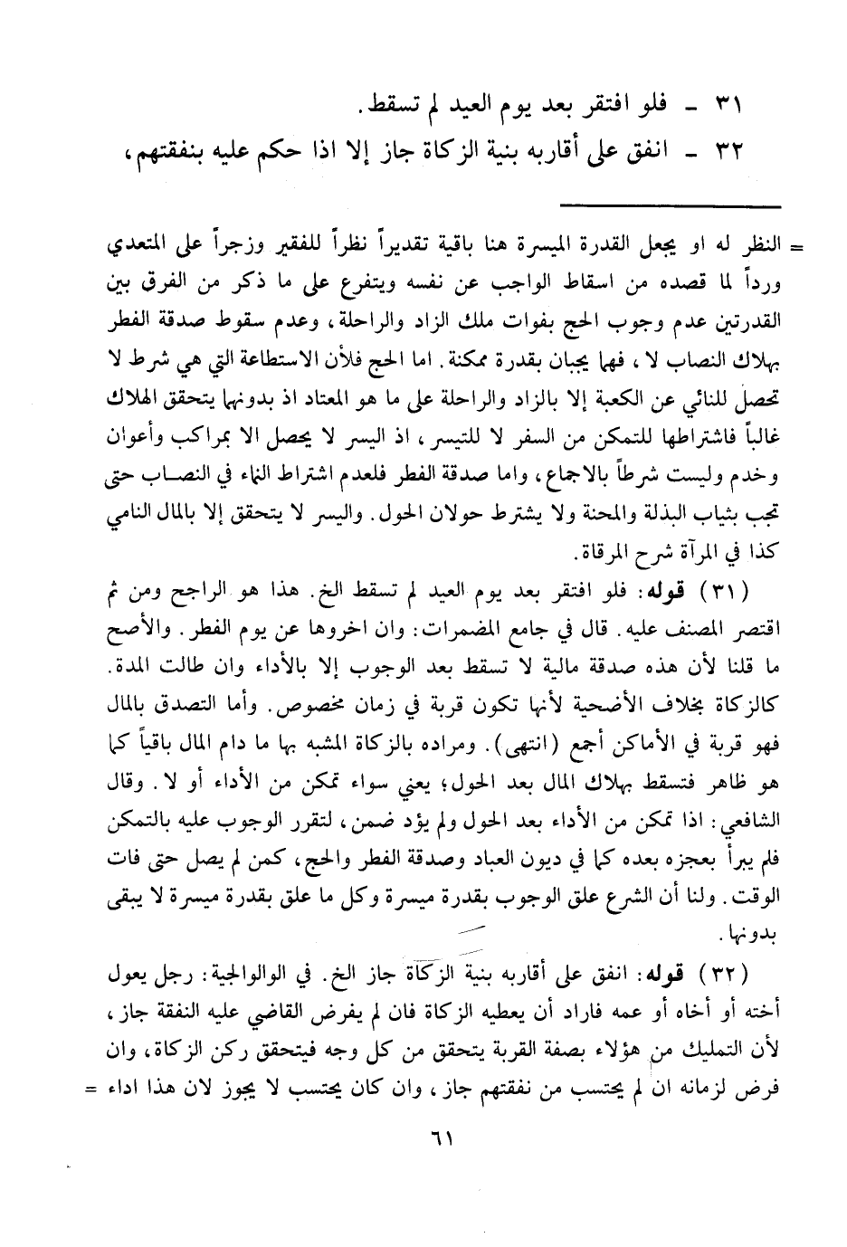 أَمَّا الْحَجُّ فَلِأَنَّ الِاسْتِطَاعَةَ الَّتِي هِيَ شَرْطٌ لَا تَحْصُلُ لِلنَّائِي عَنْ الْكَعْبَةِ إلَّا بِالزَّادِ وَالرَّاحِلَةِ عَلَى مَا هُوَ الْمُعْتَادُ إذْ بِدُونِهِمَا يَتَحَقَّقُ الْهَلَاكُ غَالِبًا فَاشْتِرَاطُهَا لِلتَّمَكُّنِ مِنْ السَّفَرِ لَا لِلتَّيَسُّرِ، إذْ الْيُسْرُ لَا يَحْصُلُ إلَّا بِمَرَاكِبَ وَأَعْوَانٍ وَخَدَمٍ وَلَيْسَتْ شَرْطًا بِالْإِجْمَاعِ، وَأَمَّا صَدَقَةُ الْفِطْرِ فَلِعَدَمِ اشْتِرَاطِ النَّمَاءِ فِي النِّصَابِ حَتَّى تَجِبَ بِثِيَابِ الْبِذْلَةِ وَالْمِحْنَةِ وَلَا يُشْتَرَطُ حَوَلَانُ الْحَوْلِ. وَالْيُسْرُ لَا يَتَحَقَّقُ إلَّا بِالْمَالِ النَّامِي كَذَا فِي الْمِرْآةِ شَرْحِ الْمِرْقَاةِ. (31) قَوْلُهُ: فَلَوْ افْتَقَرَ بَعْدَ يَوْمِ الْعِيدِ لَمْ تَسْقُطْ إلَخْ. هَذَا هُوَ الرَّاجِحُ وَمِنْ ثَمَّ اقْتَصَرَ الْمُصَنِّفُ عَلَيْهِ. قَالَ فِي جَامِعِ الْمُضْمَرَاتِ: وَإِنْ أَخَّرُوهَا عَنْ يَوْمِ الْفِطْرِ. وَالْأَصَحُّ مَا قُلْنَا لِأَنَّ هَذِهِ صَدَقَةٌ مَالِيَّةٌ لَا تَسْقُطُ بَعْدَ الْوُجُوبِ إلَّا بِالْأَدَاءِ وَإِنْ طَالَتْ الْمُدَّةُ. كَالزَّكَاةِ بِخِلَافِ الْأُضْحِيَّةِ لِأَنَّهَا تَكُونُ قُرْبَةً فِي زَمَانٍ مَخْصُوصٍ. وَأَمَّا التَّصَدُّقُ بِالْمَالِ فَهُوَ قُرْبَةٌ فِي الْأَمَاكِنِ أَجْمَعَ (انْتَهَى) .
