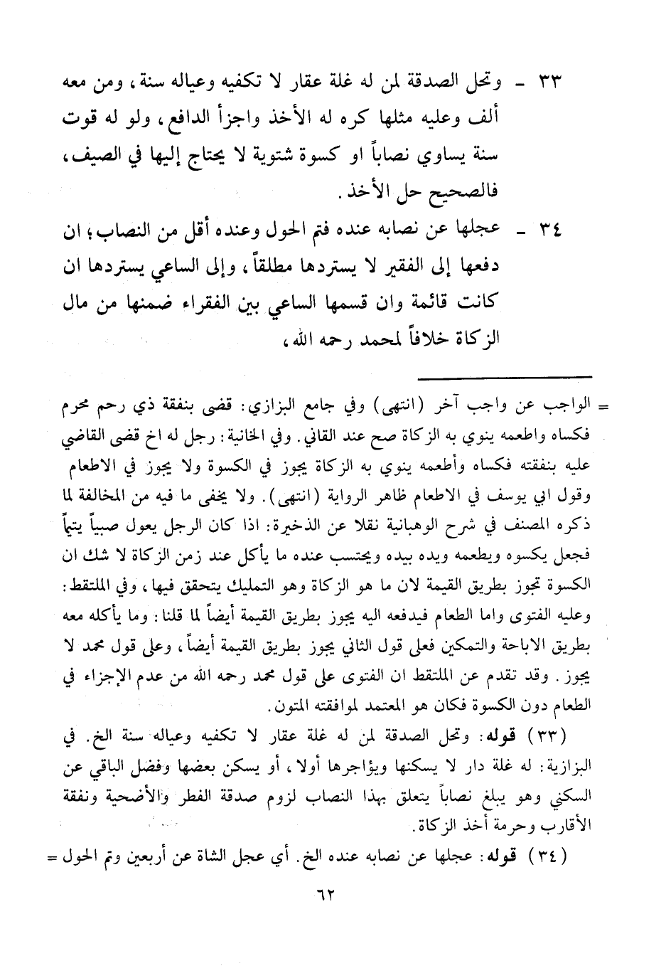 34 - عَجَّلَهَا عَنْ نِصَابِهِ عِنْدَهُ فَتَمَّ الْحَوْلُ وَعِنْدَهُ أَقَلُّ مِنْ النِّصَابِ؛ إنْ دَفَعَهَا إلَى الْفَقِيرِ لَا يَسْتَرِدُّهَا مُطْلَقًا، وَإِلَى السَّاعِي يَسْتَرِدُّهَا إنْ كَانَتْ قَائِمَةً وَإِنْ قَسَمَهَا السَّاعِي بَيْنَ الْفُقَرَاءِ ضَمِنَهَا مِنْ مَالِ الزَّكَاةِ خِلَافًا لِمُحَمَّدٍ - رَحِمَهُ اللَّهُ -