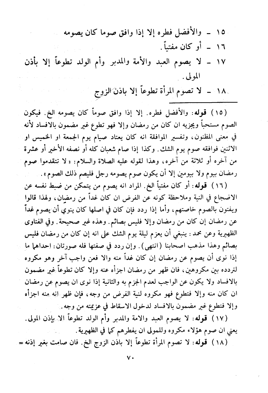 (17) قَوْلُهُ: لَا يَصُومُ الْعَبْدُ وَالْأَمَةُ وَالْمُدَبَّرُ وَأُمُّ الْوَلَدِ تَطَوُّعًا إلَّا بِإِذْنِ الْمَوْلَى. يَعْنِي أَنَّ صَوْمَ هَؤُلَاءِ مَكْرُوهٌ وَلِلْمَوْلَى أَنْ يُفَطِّرَهُمْ كَمَا فِي الظَّهِيرِيَّةِ